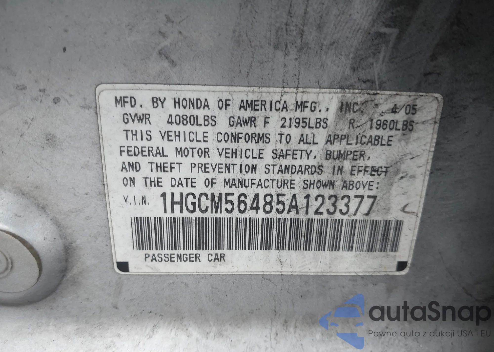 The car Honda Accord 2005 (VIN 1HGCM56485A123377) has not been auctioned before. The documents are clean, and the mileage matches or is below the market average. Sold by an insurance company – we recommend purchase. Delivery to the port will take approx. 6–8 weeks.