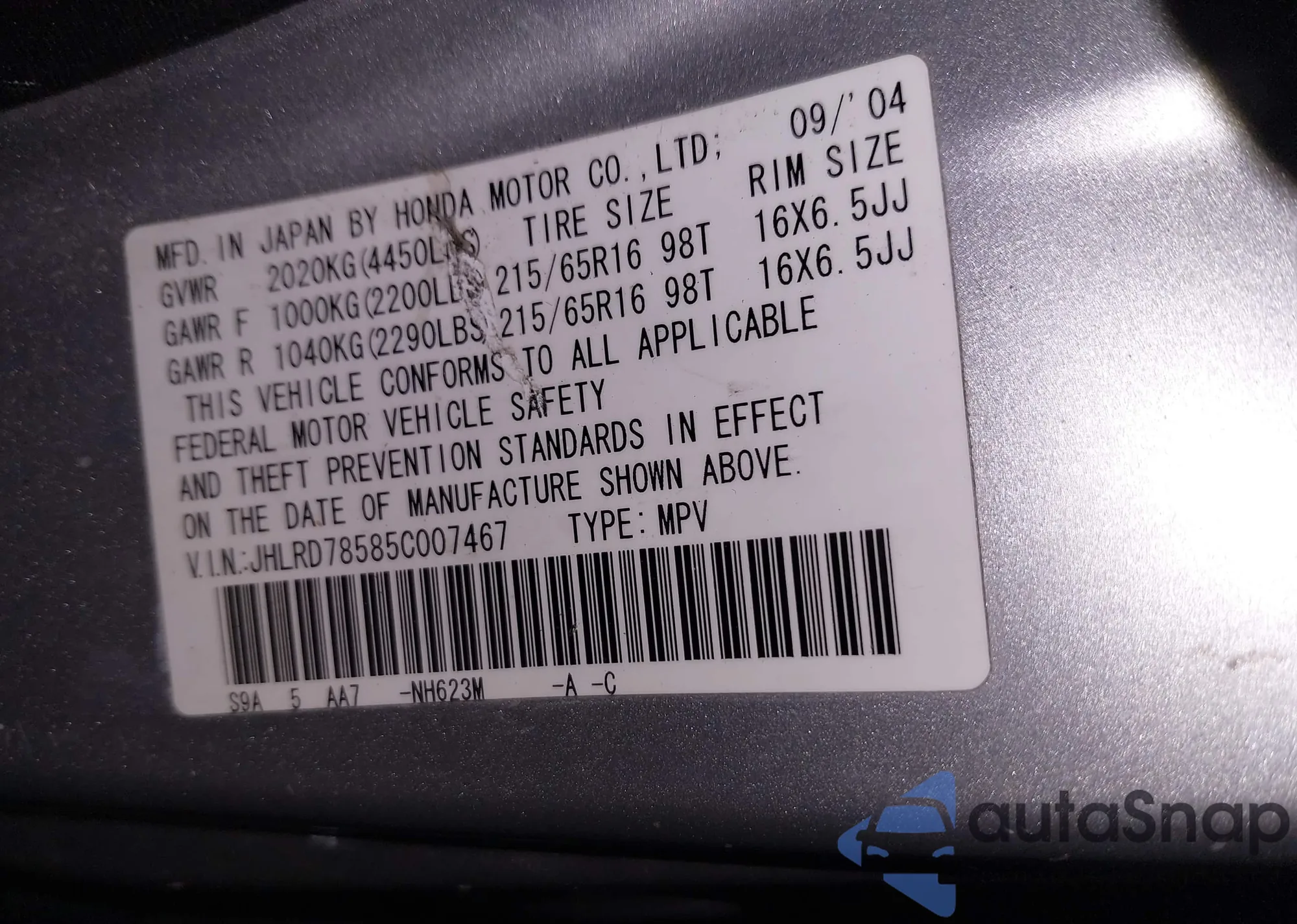 VIN: JHLRD78585C007467