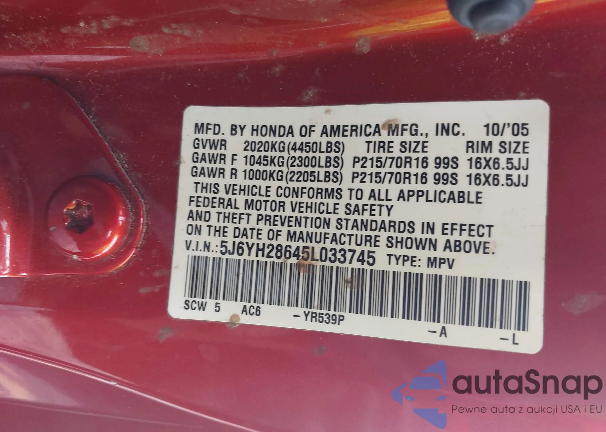VIN: 5J6YH28645L033745