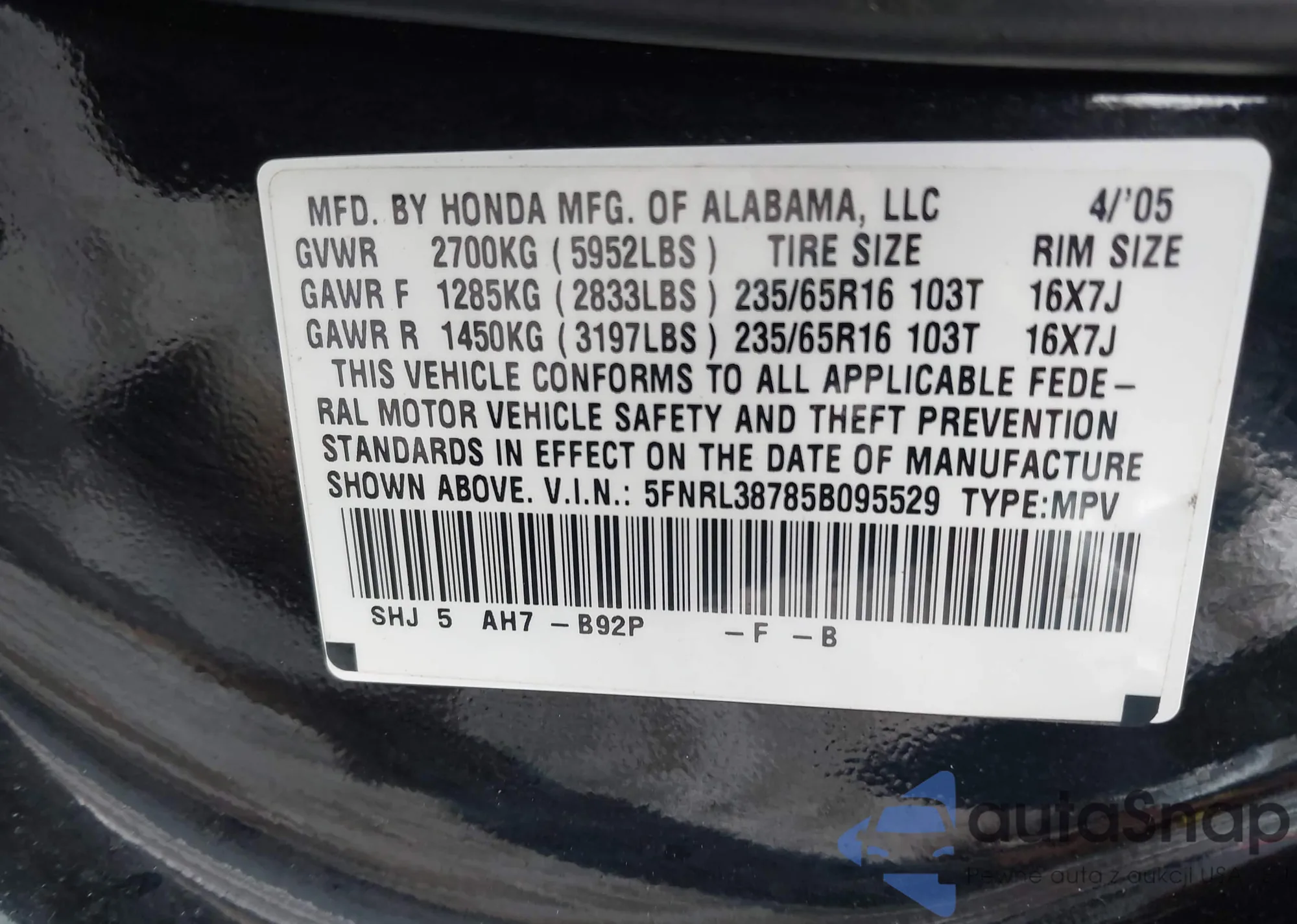 The car Honda Odyssey 2005 (VIN 5FNRL38785B095529) has not been auctioned before. The documents are clean, and the mileage matches or is below the market average. Sold by an insurance company – we recommend purchase. Delivery to the port will take approx. 6–8 weeks.