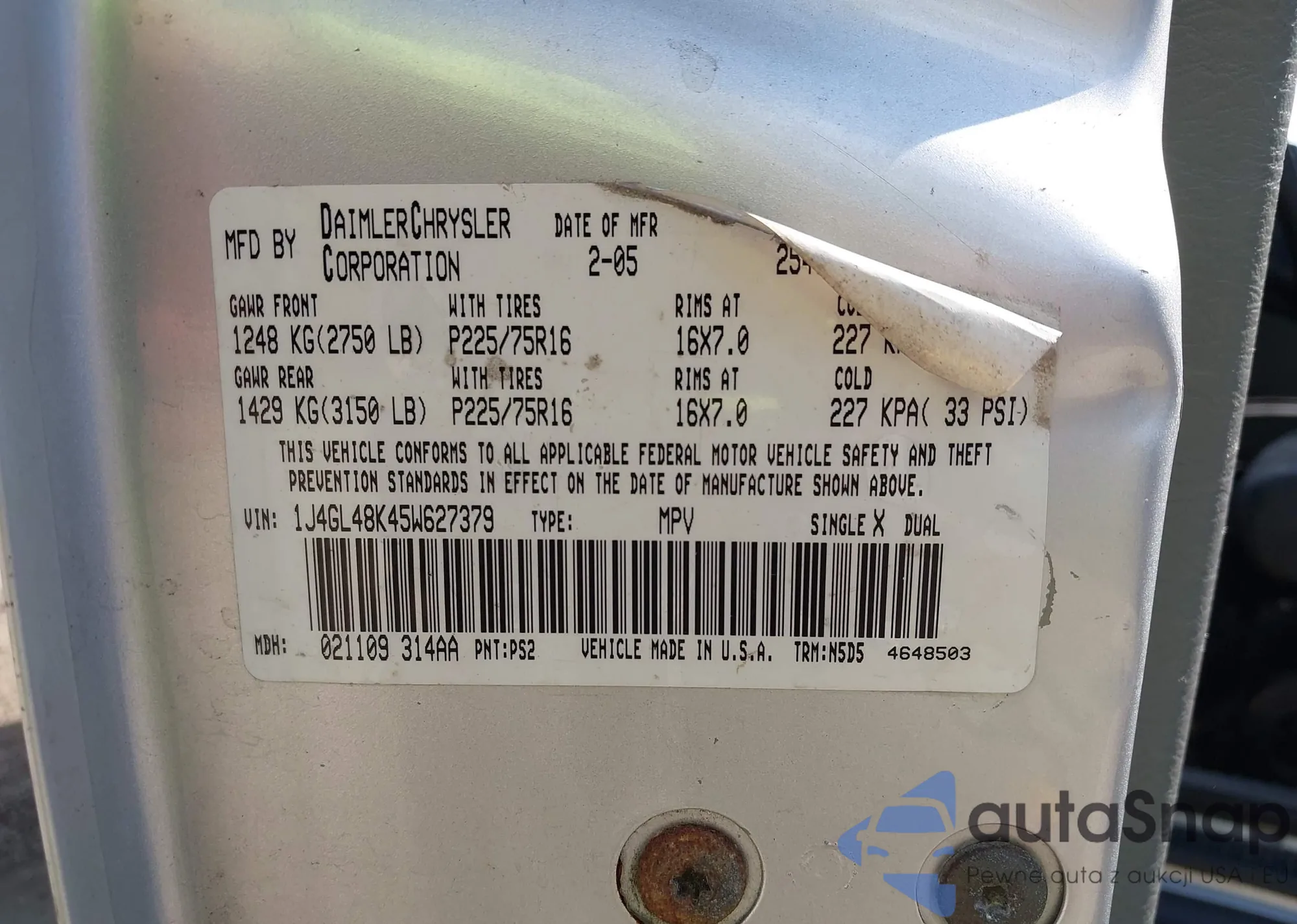 VIN: 1J4GL48K45W627379