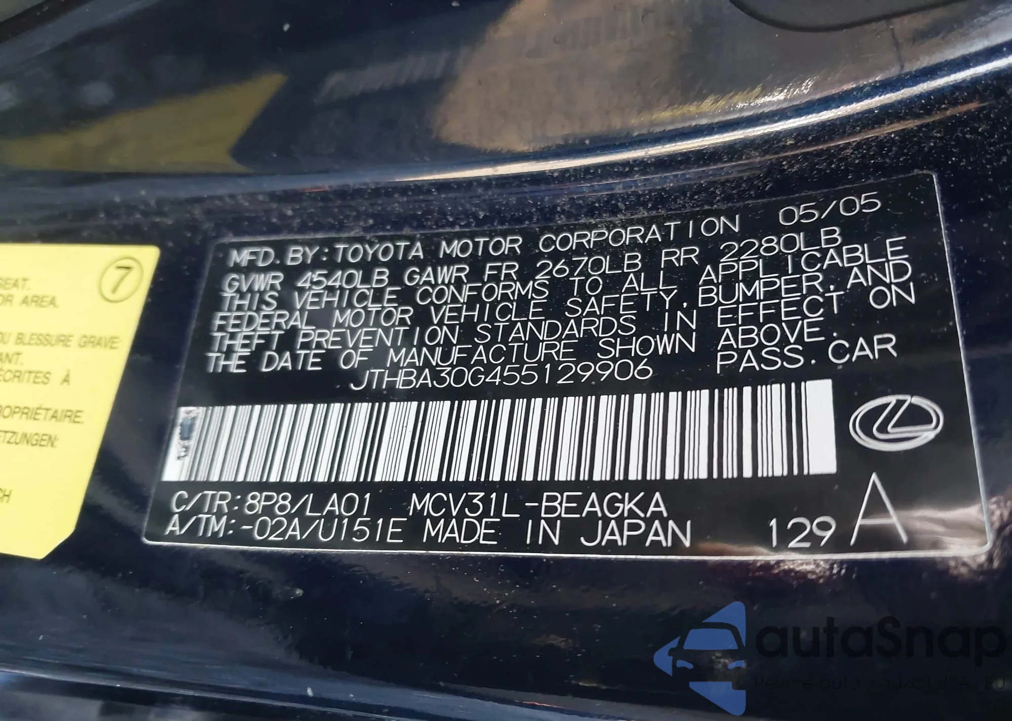 VIN: JTHBA30G455129906