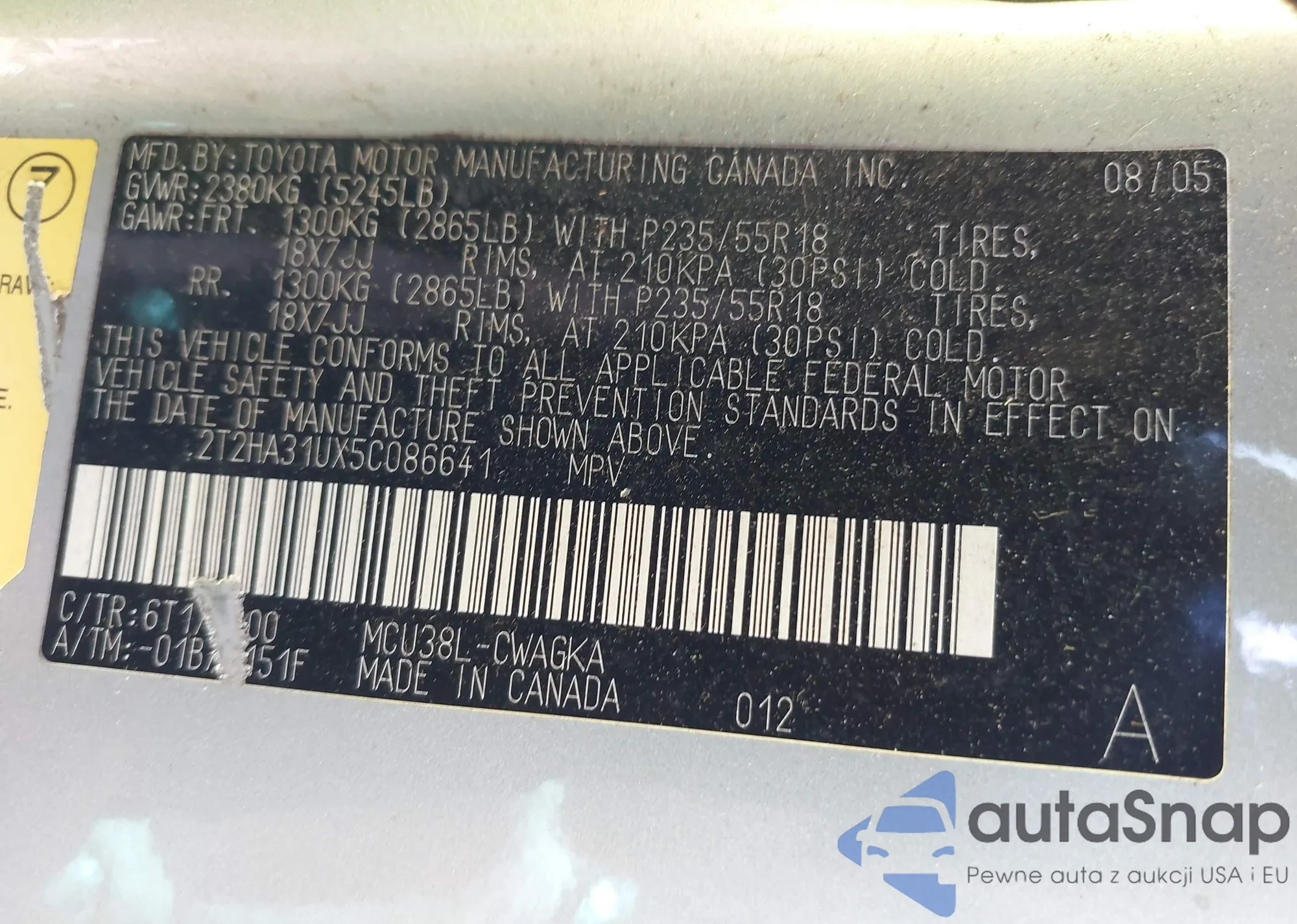 VIN: 2T2HA31UX5C086641