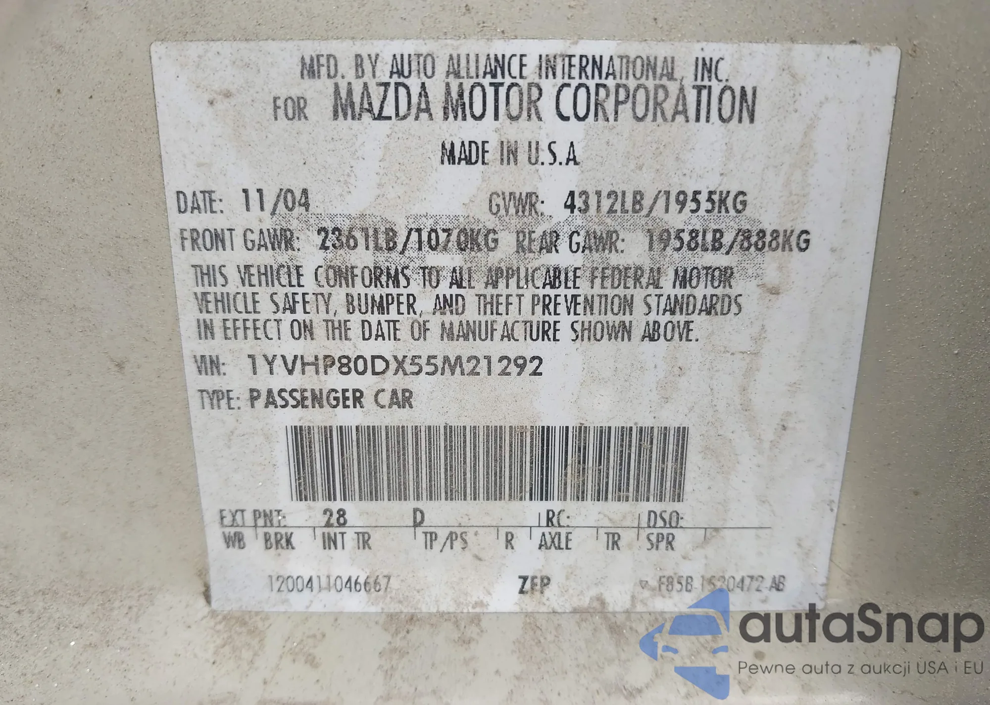 VIN: 1YVHP80DX55M21292