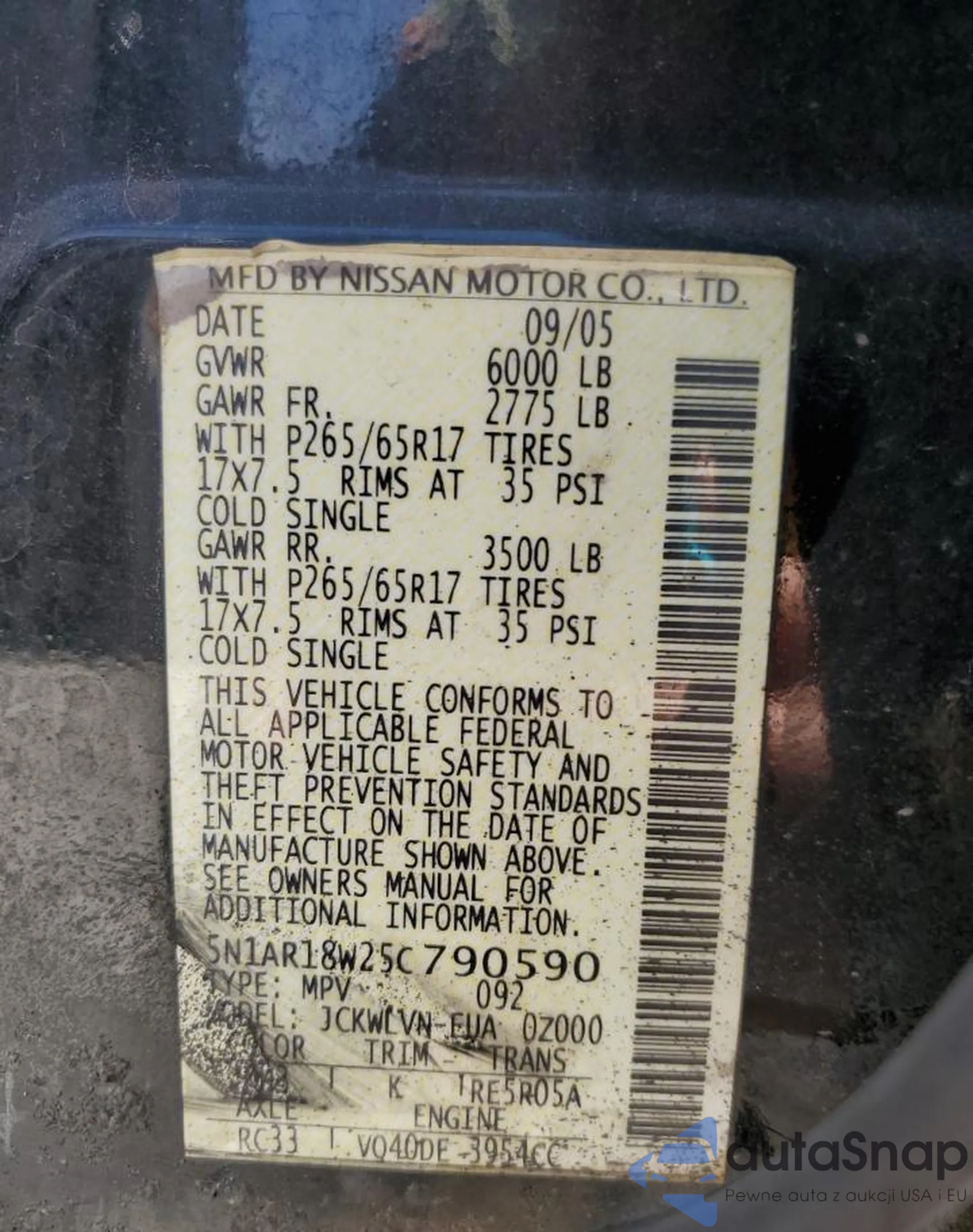 The car Nissan Pathfinder 2005 (VIN 5N1AR18W25C790590) is sold by an unverified seller. We recommend checking the Carfax report and confirming registration possibilities before purchase.