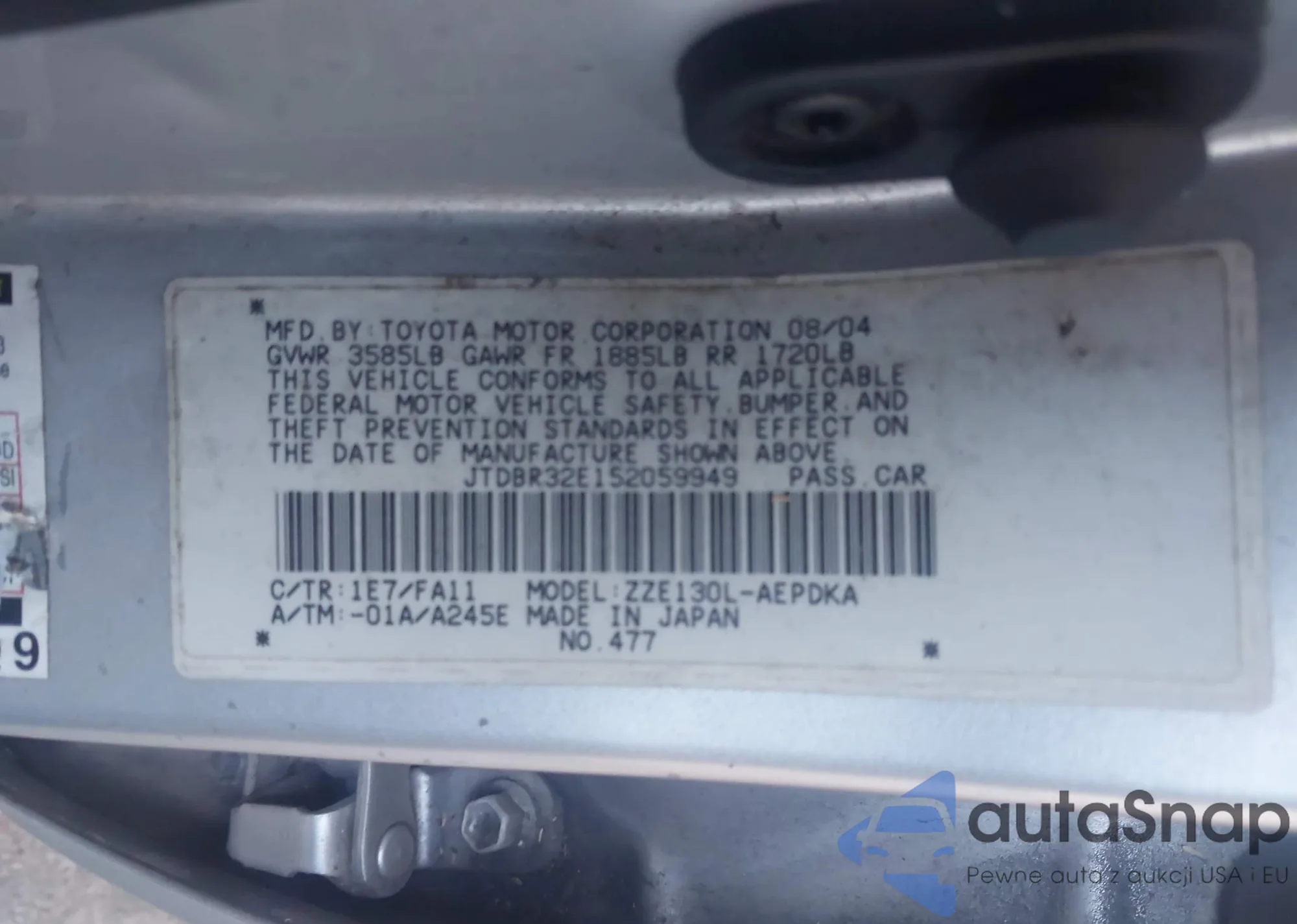 The car Toyota Corolla 2005 (VIN JTDBR32E152059949) has documents that prevent registration. Export and registration may be difficult. Contact AutaSnap experts to find alternatives.