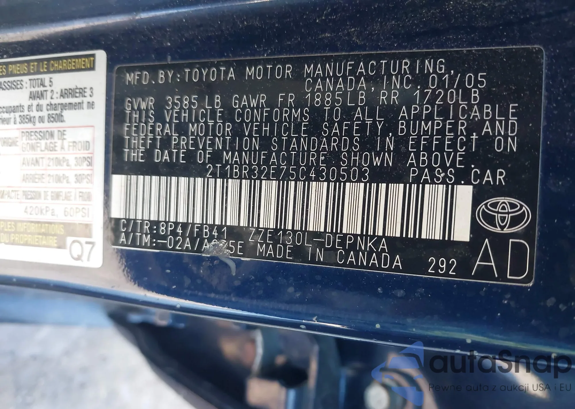 The car Toyota Corolla 2005 (VIN 2T1BR32E75C430503) is sold by an unverified seller. We recommend checking the Carfax report and confirming registration possibilities before purchase.