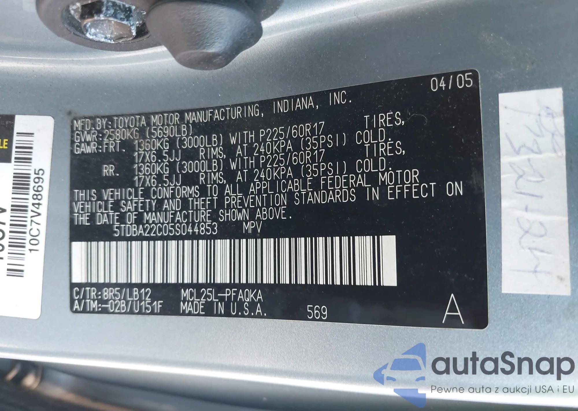 The car Toyota Sienna 2005 (VIN 5TDBA22C05S044853) has not been auctioned before. The documents are clean, and the mileage matches or is below the market average. Sold by an insurance company – we recommend purchase. Delivery to the port will take approx. 6–8 weeks.