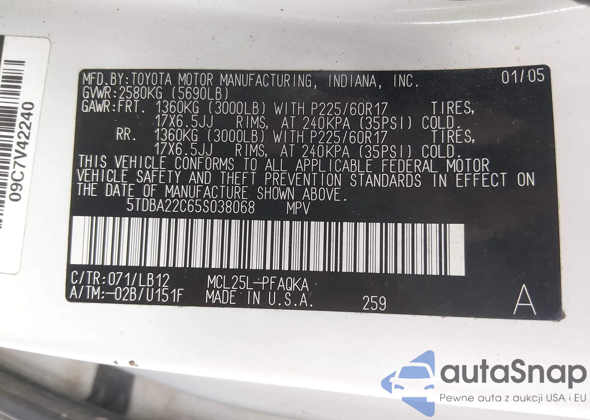 The car Toyota Sienna 2005 (VIN 5TDBA22C65S038068) is sold by an unverified seller. We recommend checking the Carfax report and confirming registration possibilities before purchase.