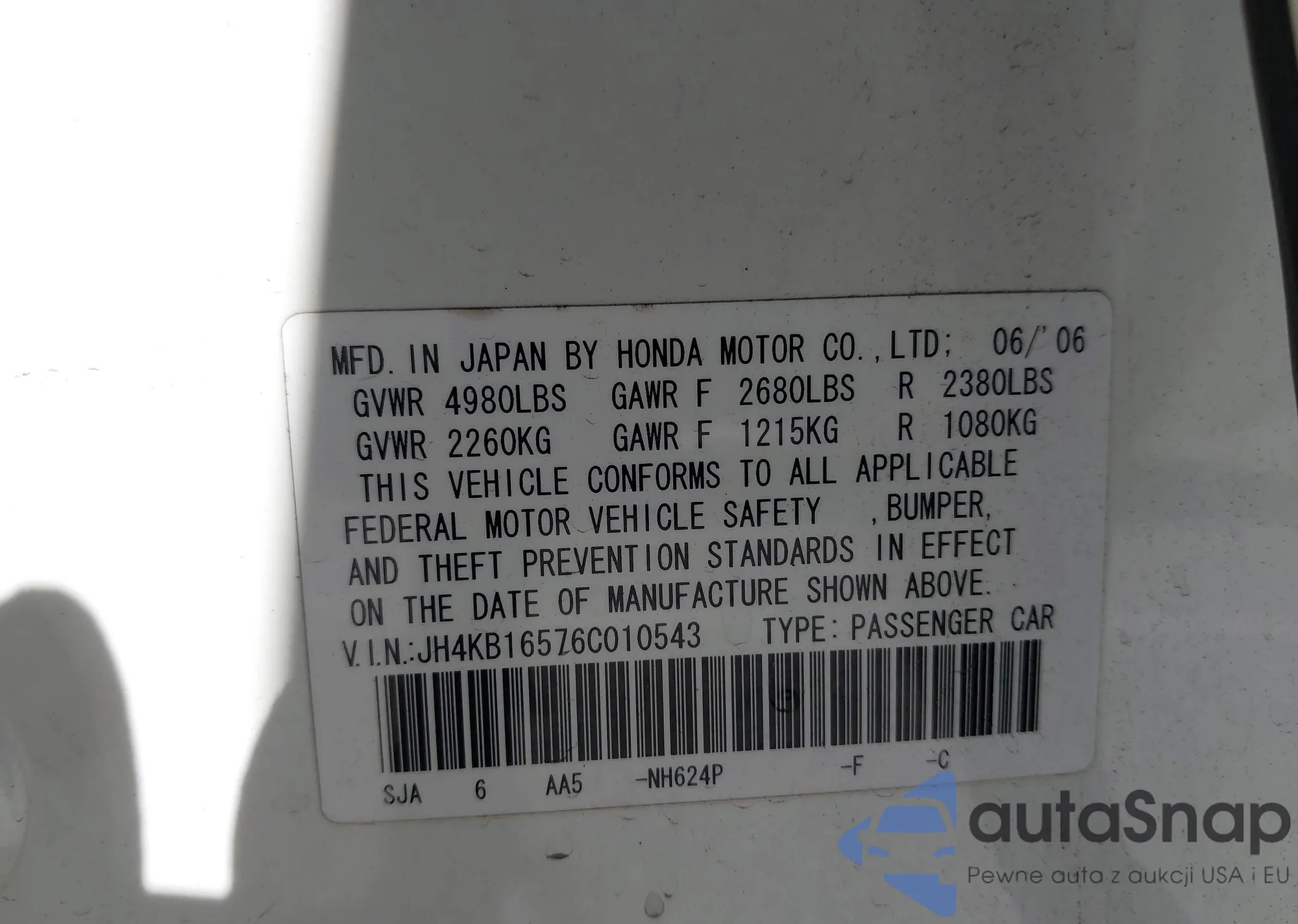 The car Acura RL 2006 (VIN JH4KB16576C010543) has not been auctioned before. The documents are clean, and the mileage matches or is below the market average. Sold by an insurance company – we recommend purchase. Delivery to the port will take approx. 6–8 weeks.
