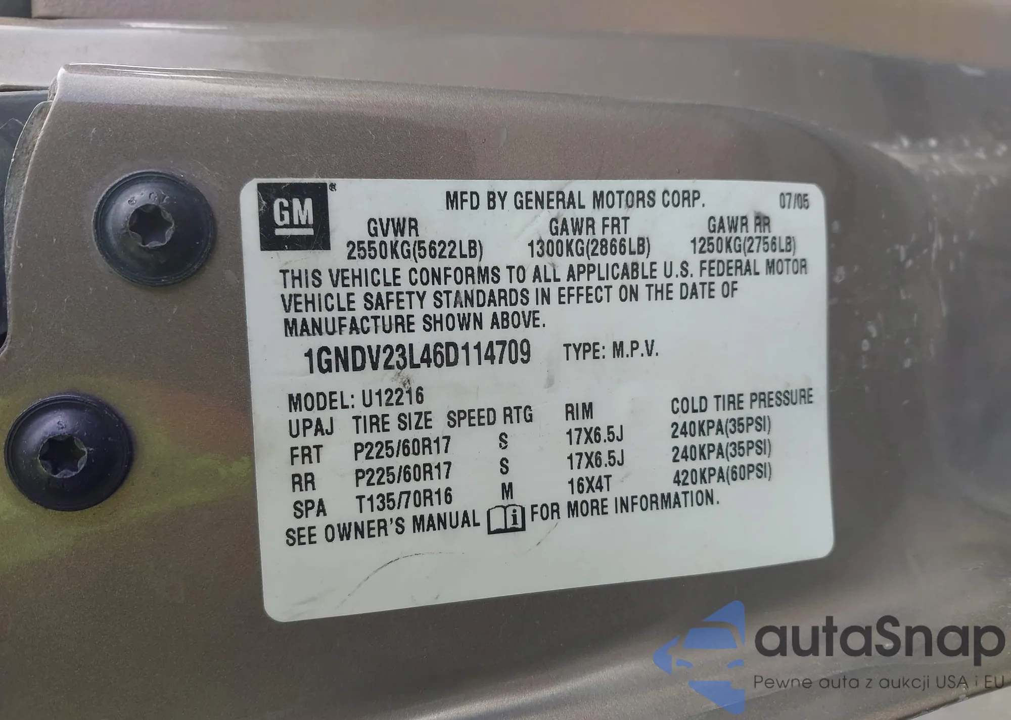 The car Chevrolet Uplander 2006 (VIN 1GNDV23L46D114709) has not been auctioned before. The documents are clean, and the mileage matches or is below the market average. Sold by an insurance company – we recommend purchase. Delivery to the port will take approx. 6–8 weeks.