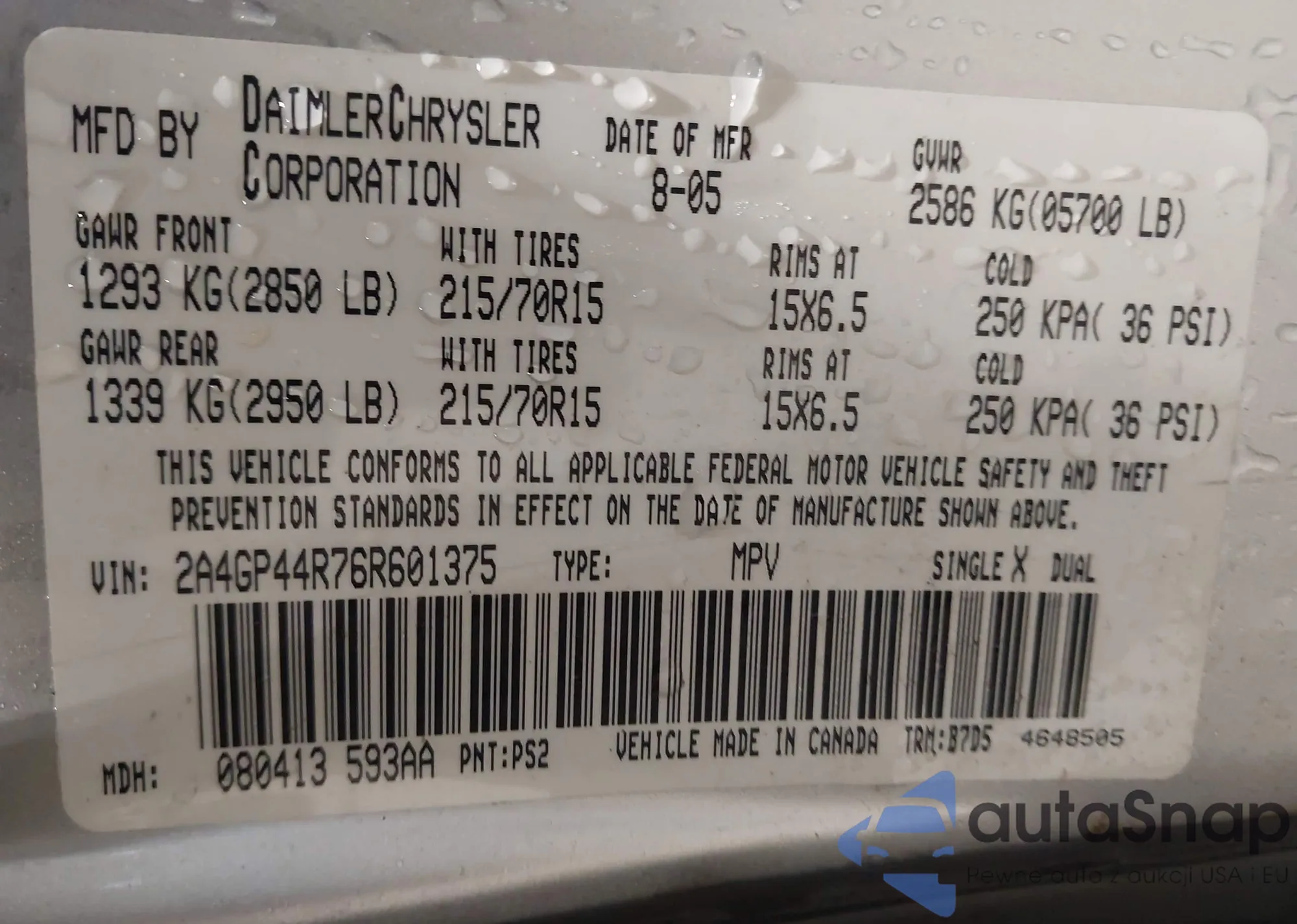 • VIN: 2A4GP44R76R601375