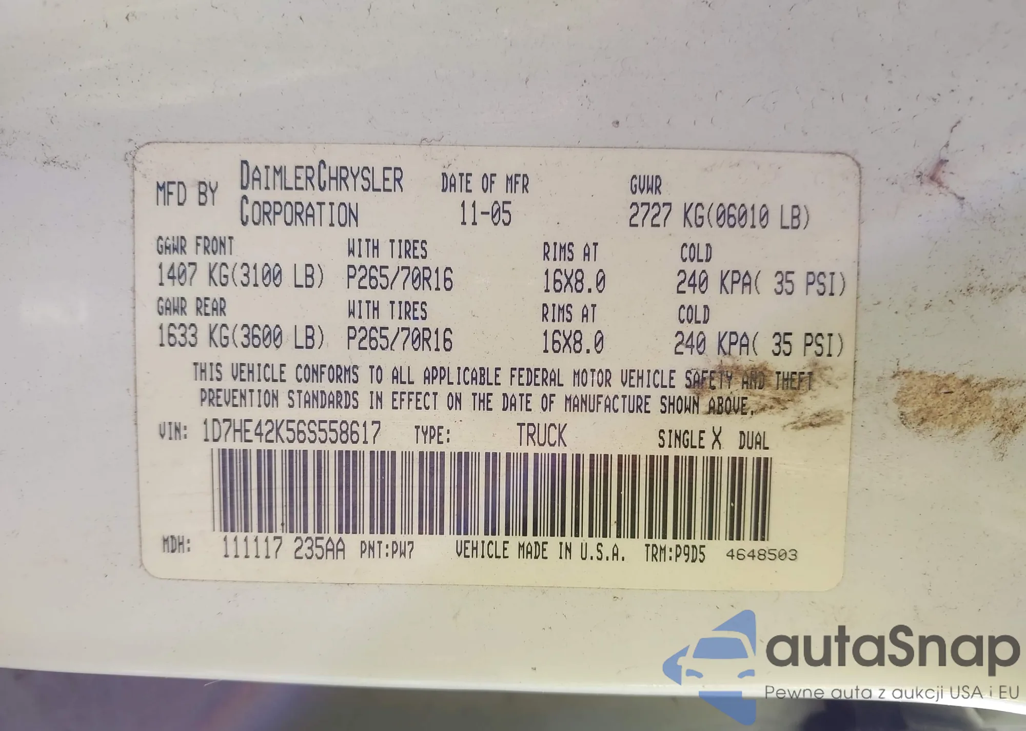 The car Dodge Dakota 2006 (VIN 1D7HE42K56S558617) is sold by an unverified seller. We recommend checking the Carfax report and confirming registration possibilities before purchase.