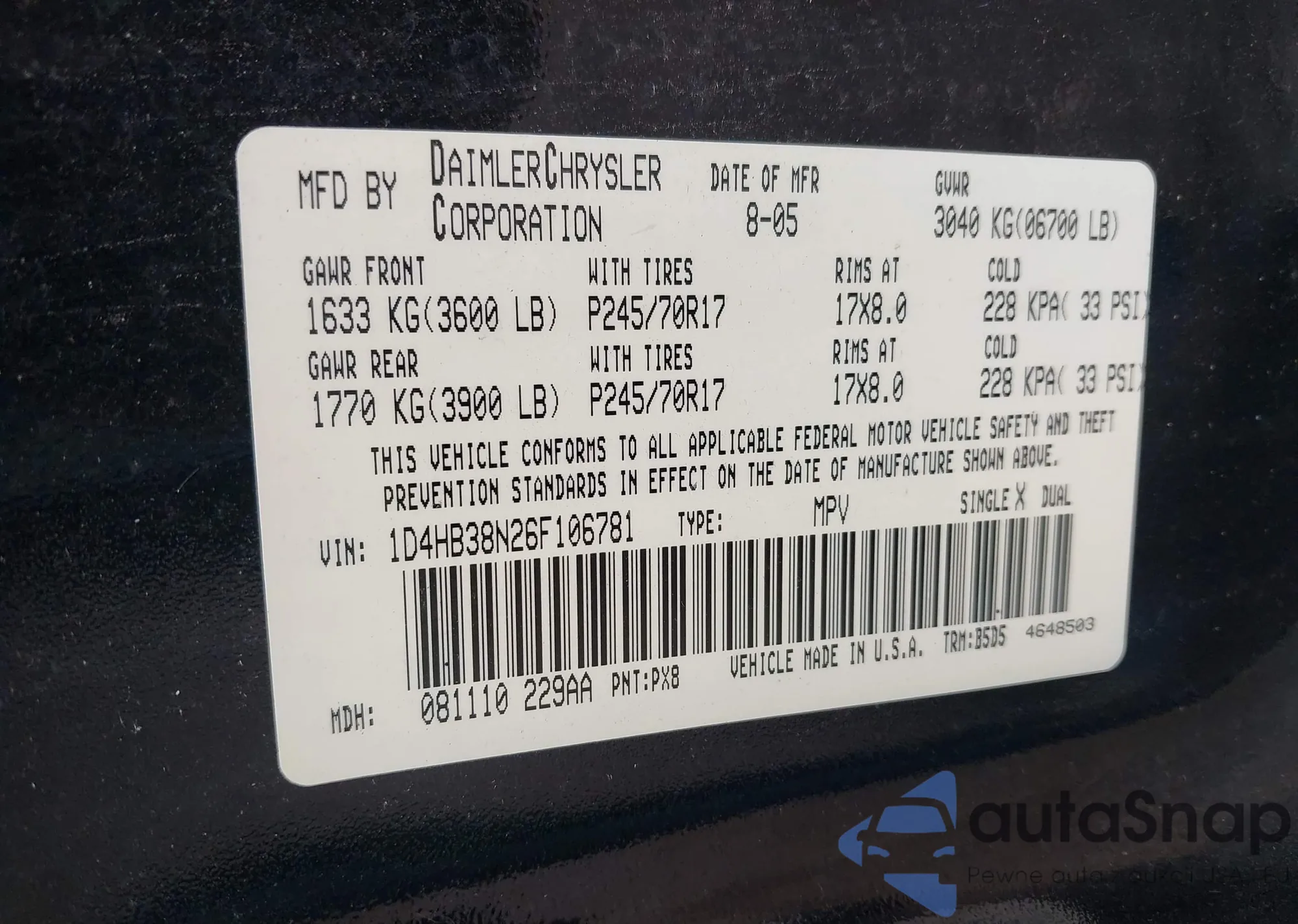 The car Dodge Durango 2006 (VIN 1D4HB38N26F106781) is sold by an unverified seller. We recommend checking the Carfax report and confirming registration possibilities before purchase.
