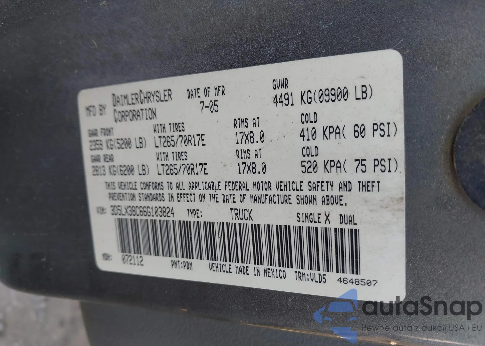 The car Dodge RAM 2006 (VIN 3D5LX38C66G103824) has not been auctioned before. The documents are clean, and the mileage matches or is below the market average. Sold by an insurance company – we recommend purchase. Delivery to the port will take approx. 6–8 weeks.
