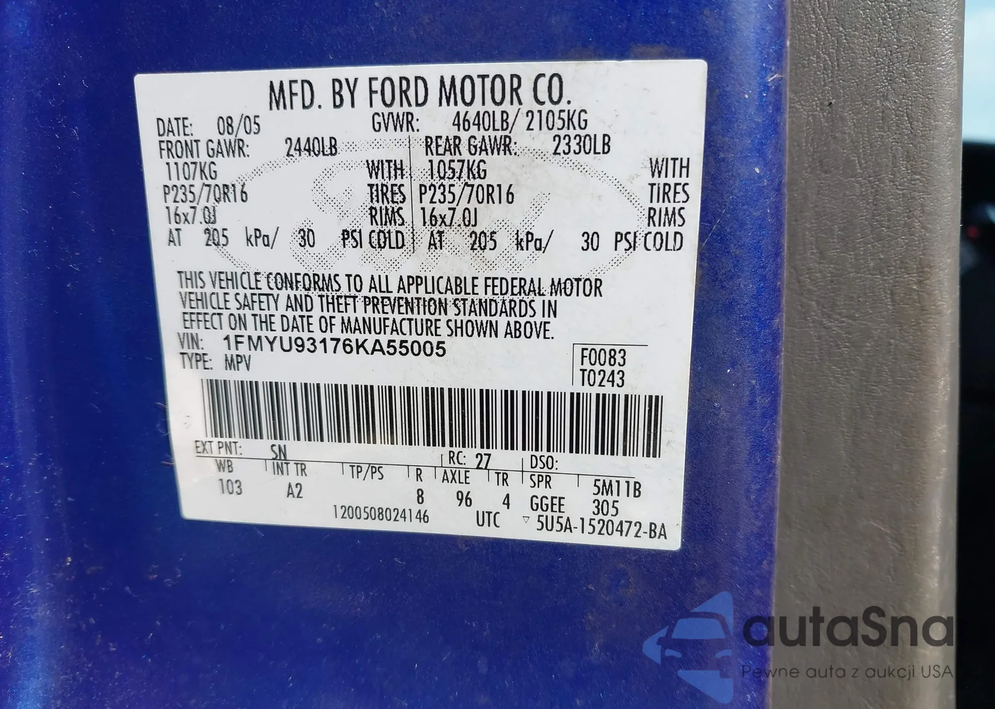 VIN: 1FMYU93176KA55005
