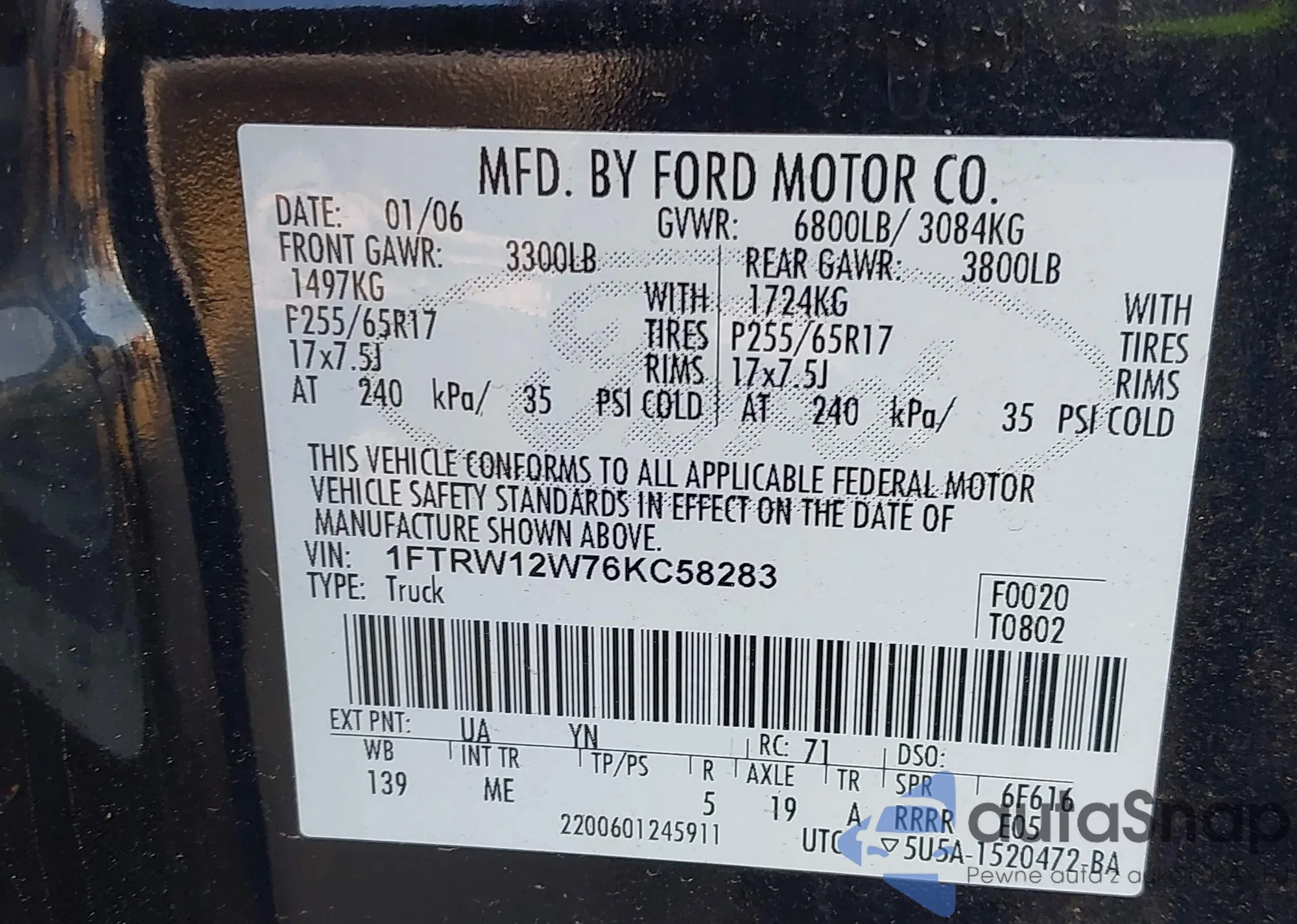 VIN: 1FTRW12W76KC58283