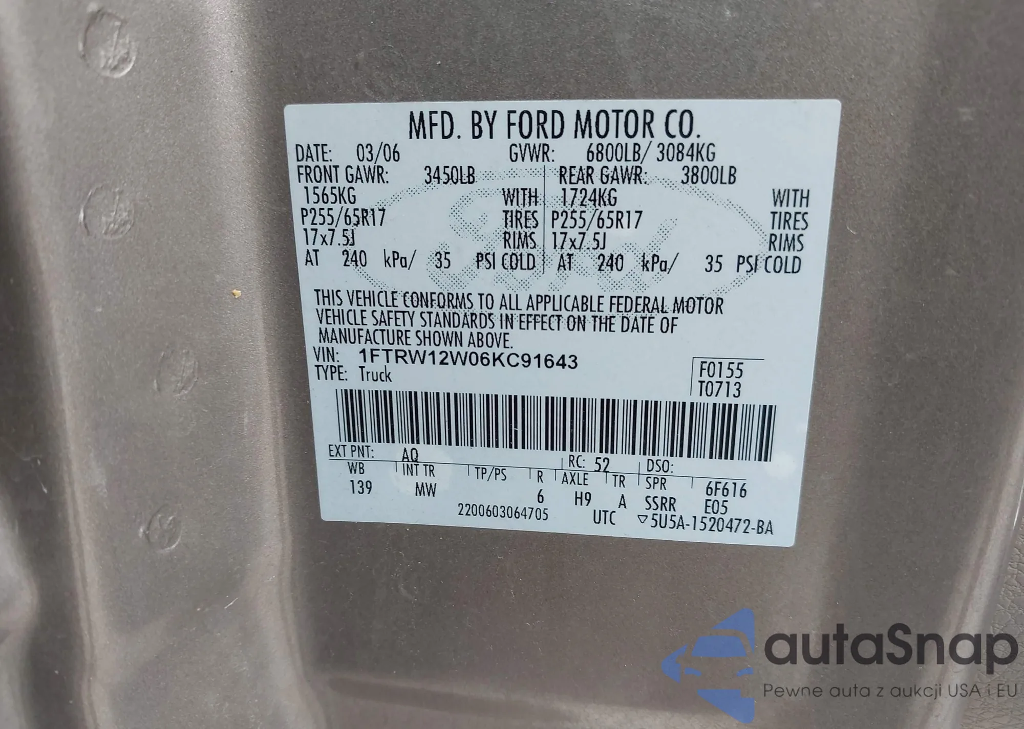• VIN: 1FTRW12W06KC91643