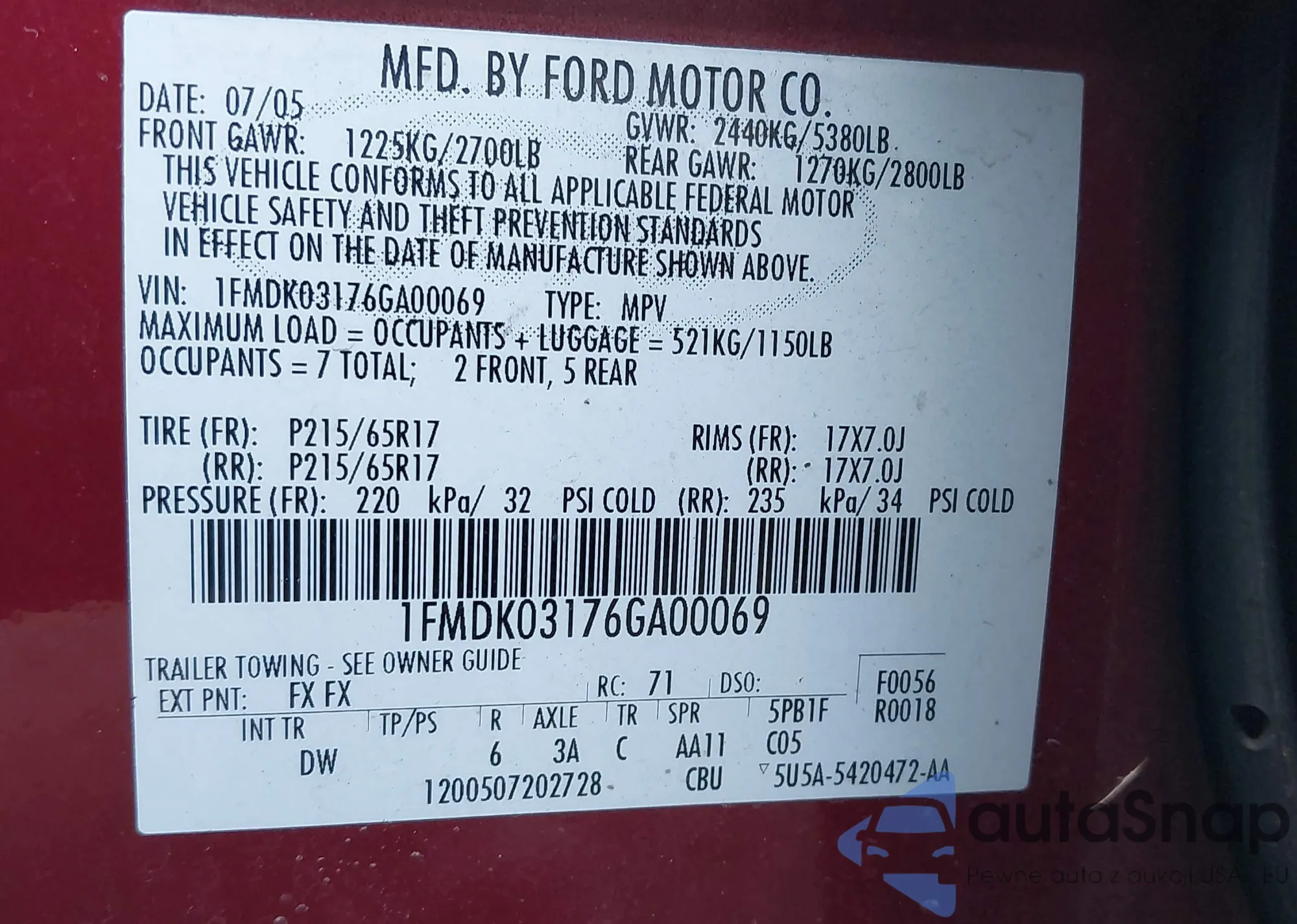 VIN: 1FMDK03176GA00069