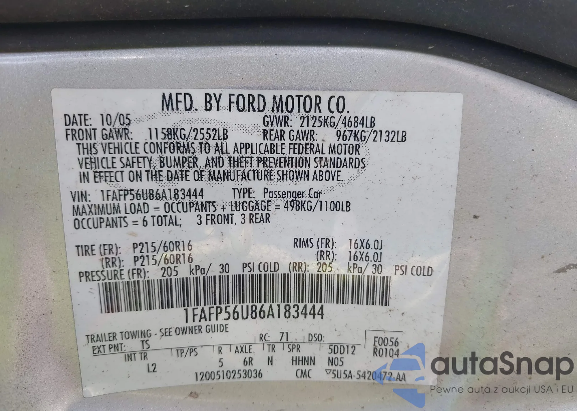 VIN: 1FAFP56U86A183444