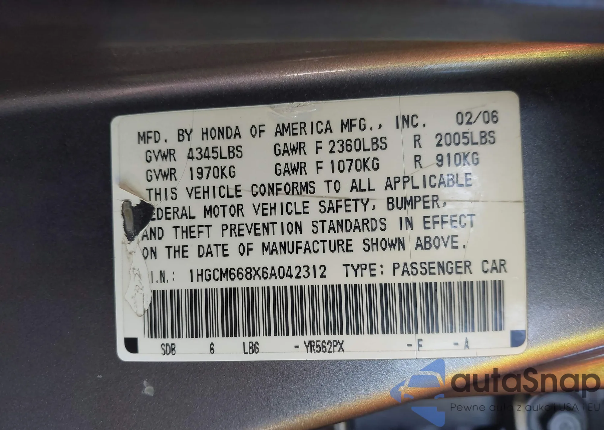 The car Honda Accord 2006 (VIN 1HGCM668X6A042312) has not been auctioned before. The documents are clean, and the mileage matches or is below the market average. Sold by an insurance company – we recommend purchase. Delivery to the port will take approx. 6–8 weeks.