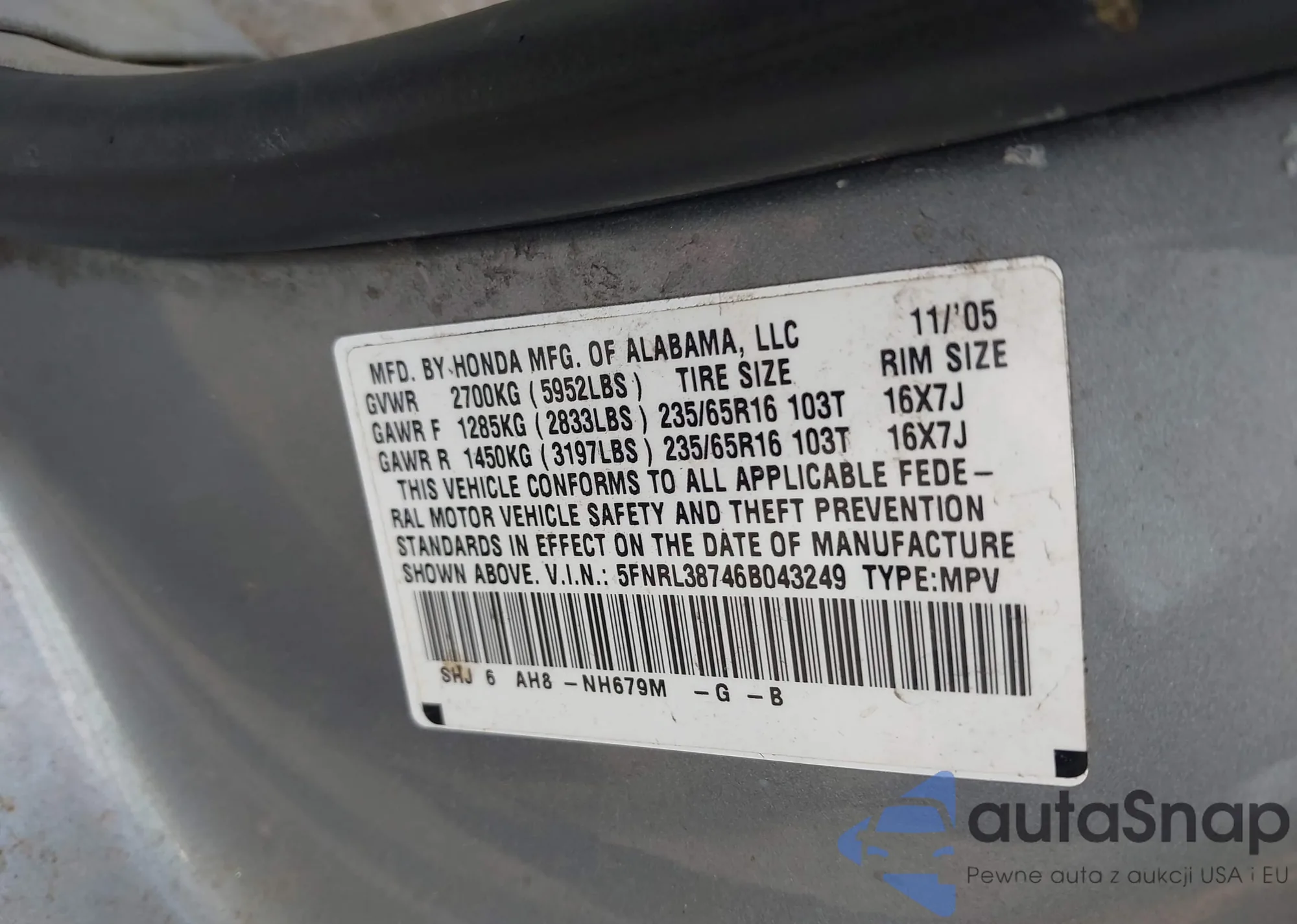 VIN: 5FNRL387868043249