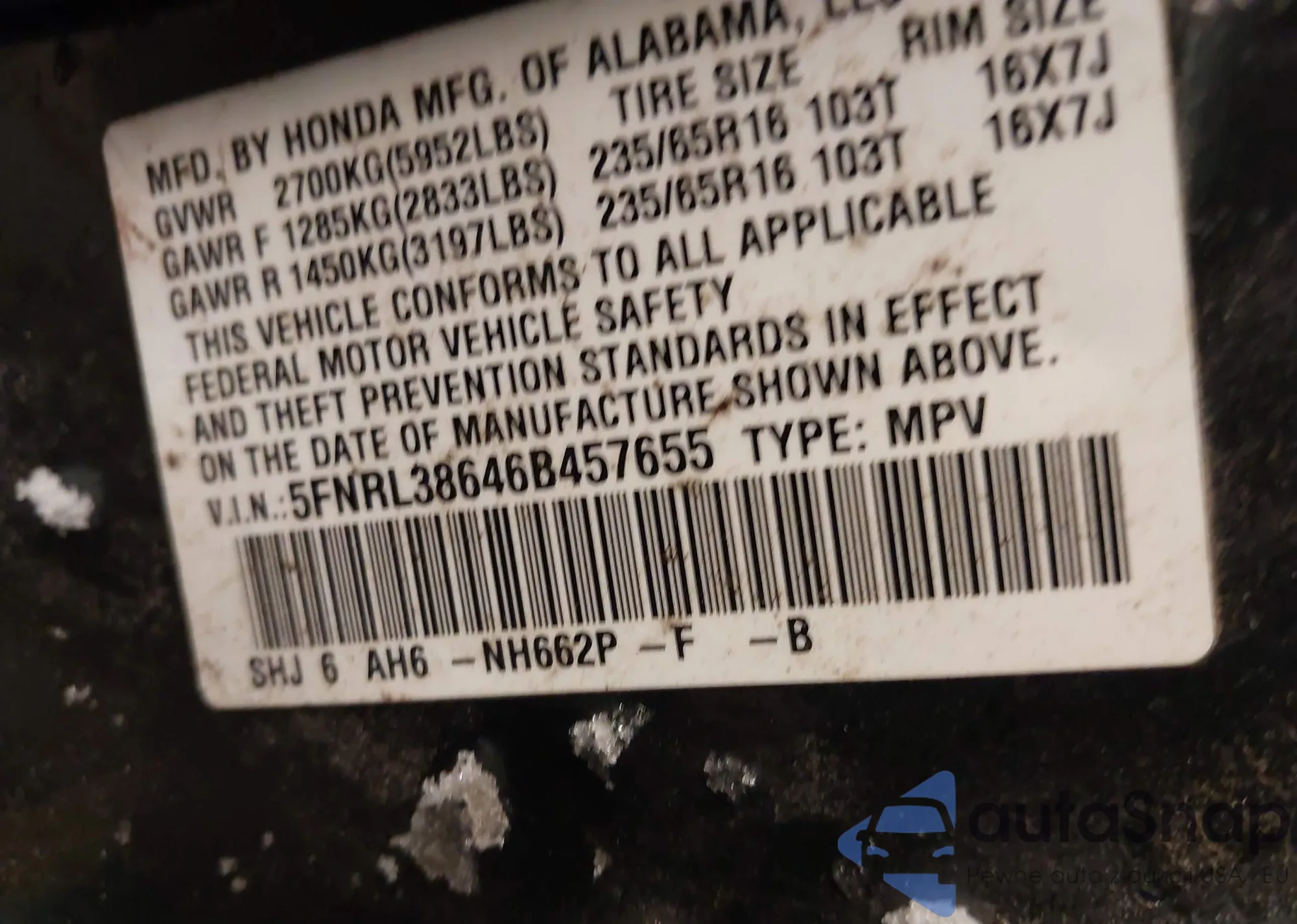 VIN: 5FNRL38646B457655
