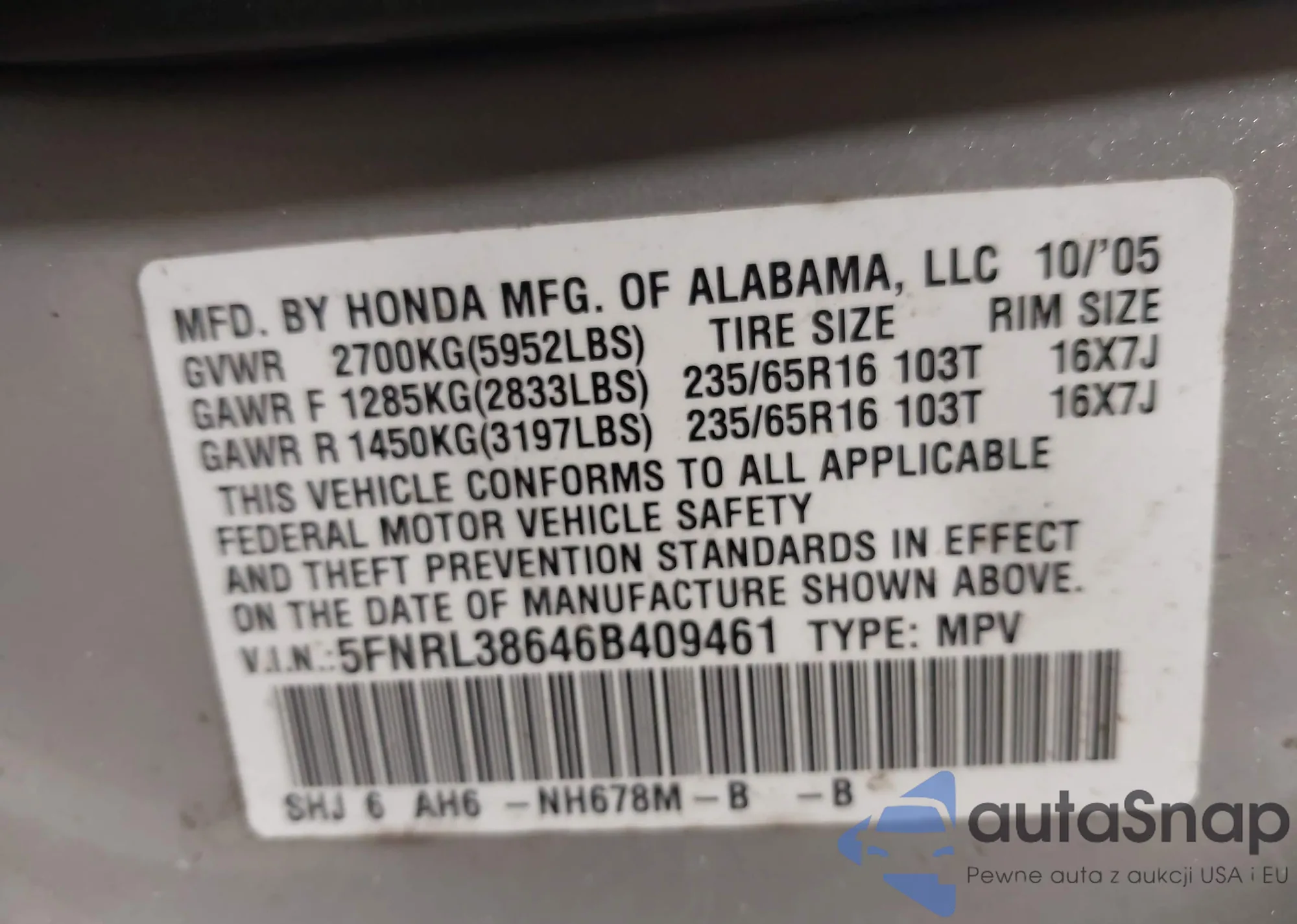 VIN: 5FNRL38646B409461