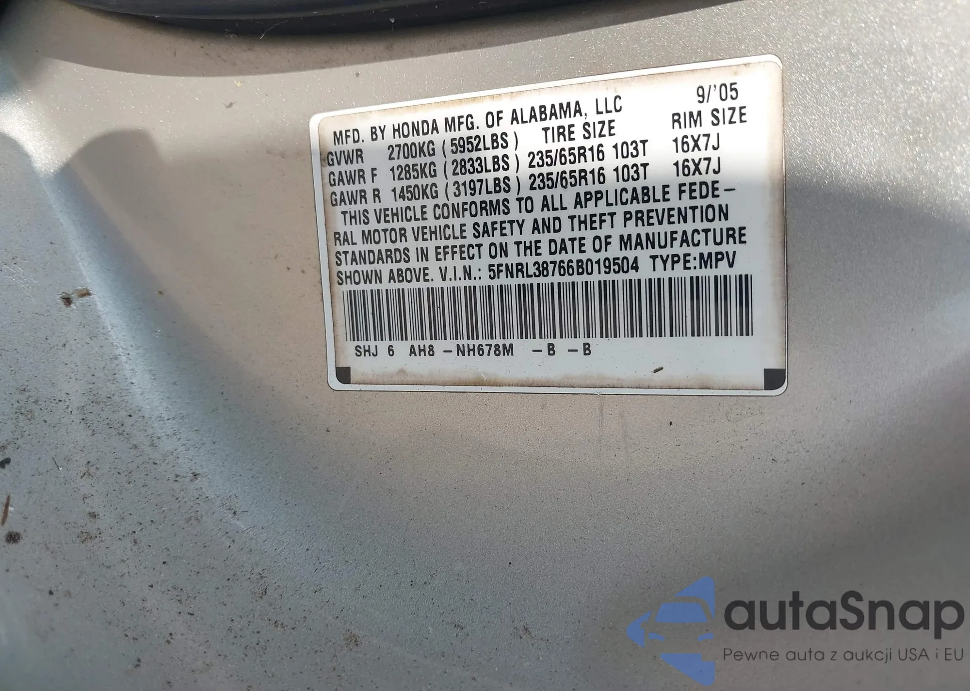 VIN: 5FNRL38766B019504