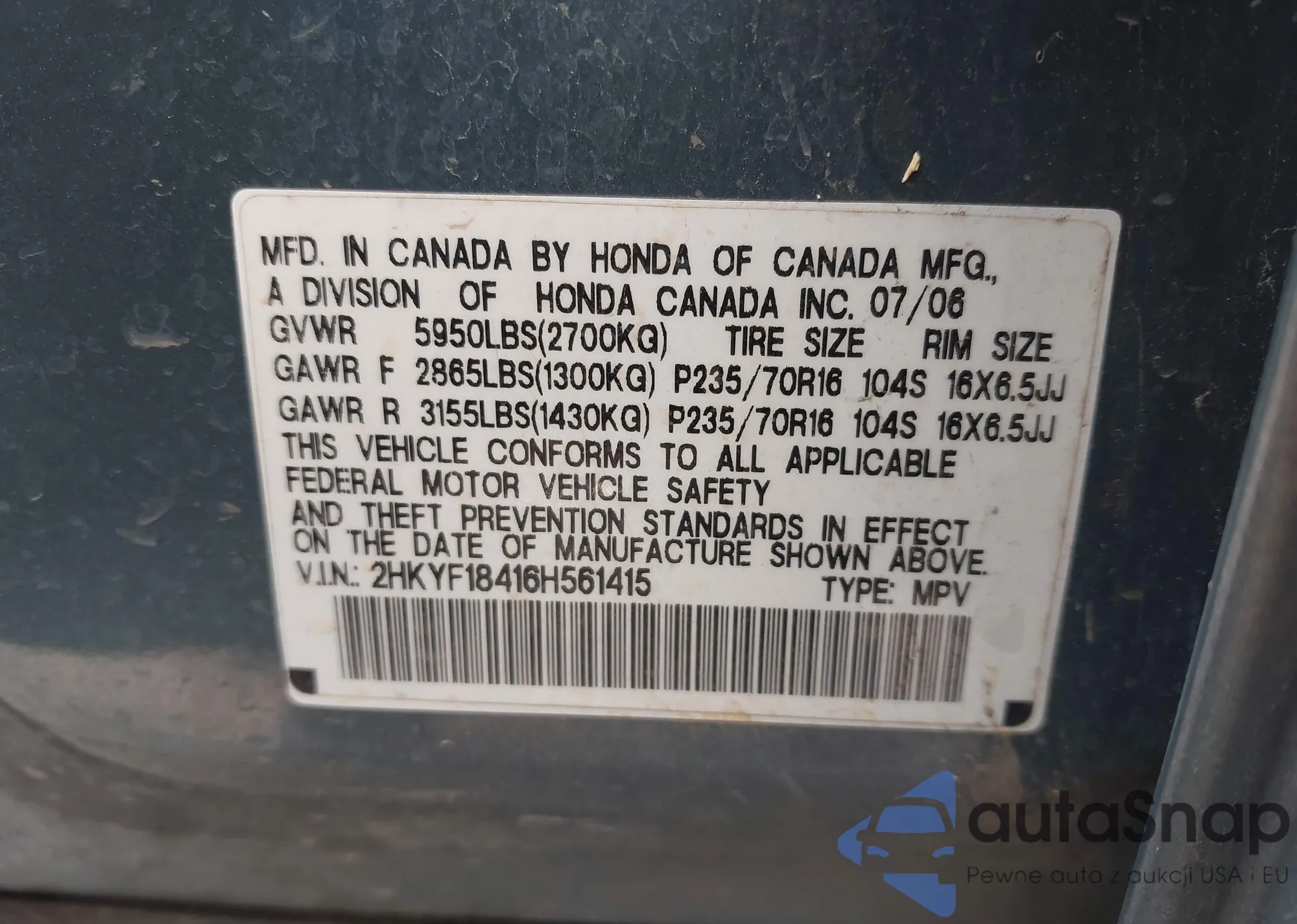 VIN: 2HKYF18416H561415