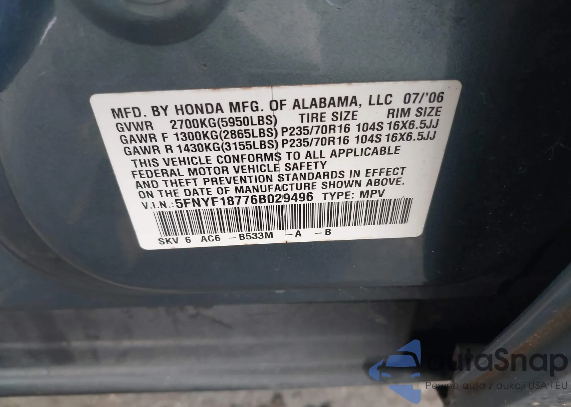 VIN: 5FNYF18776B029496