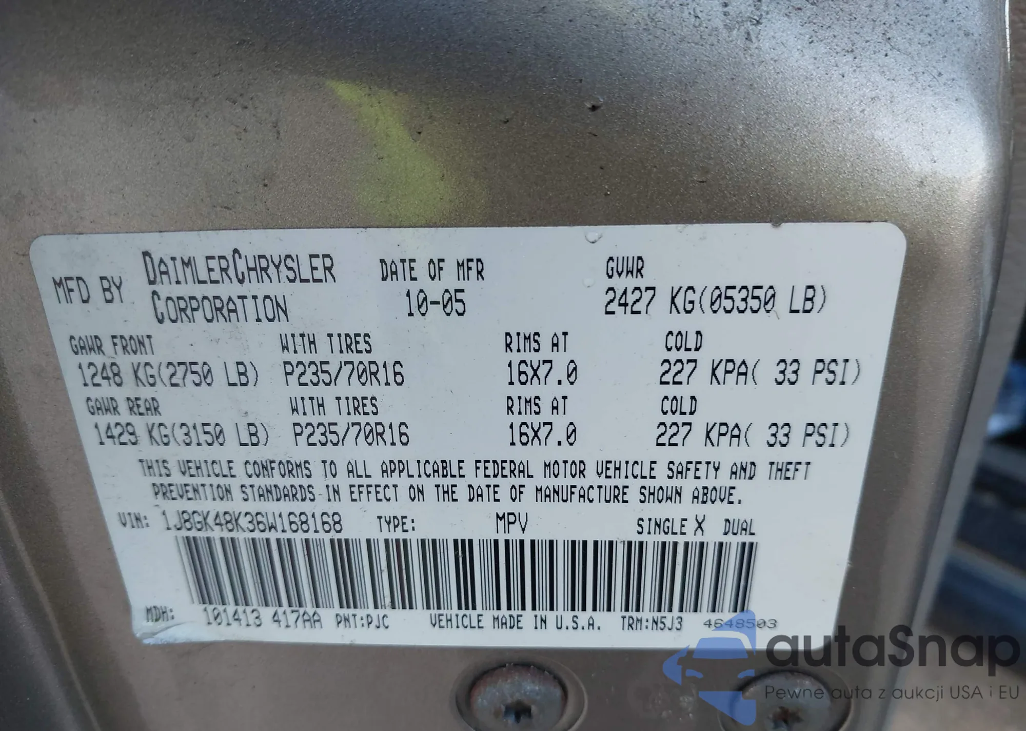 The car Jeep Liberty (North America) 2006 (VIN 1J8GK48K36W168168) has documents that prevent registration. Export and registration may be difficult. Contact AutaSnap experts to find alternatives.