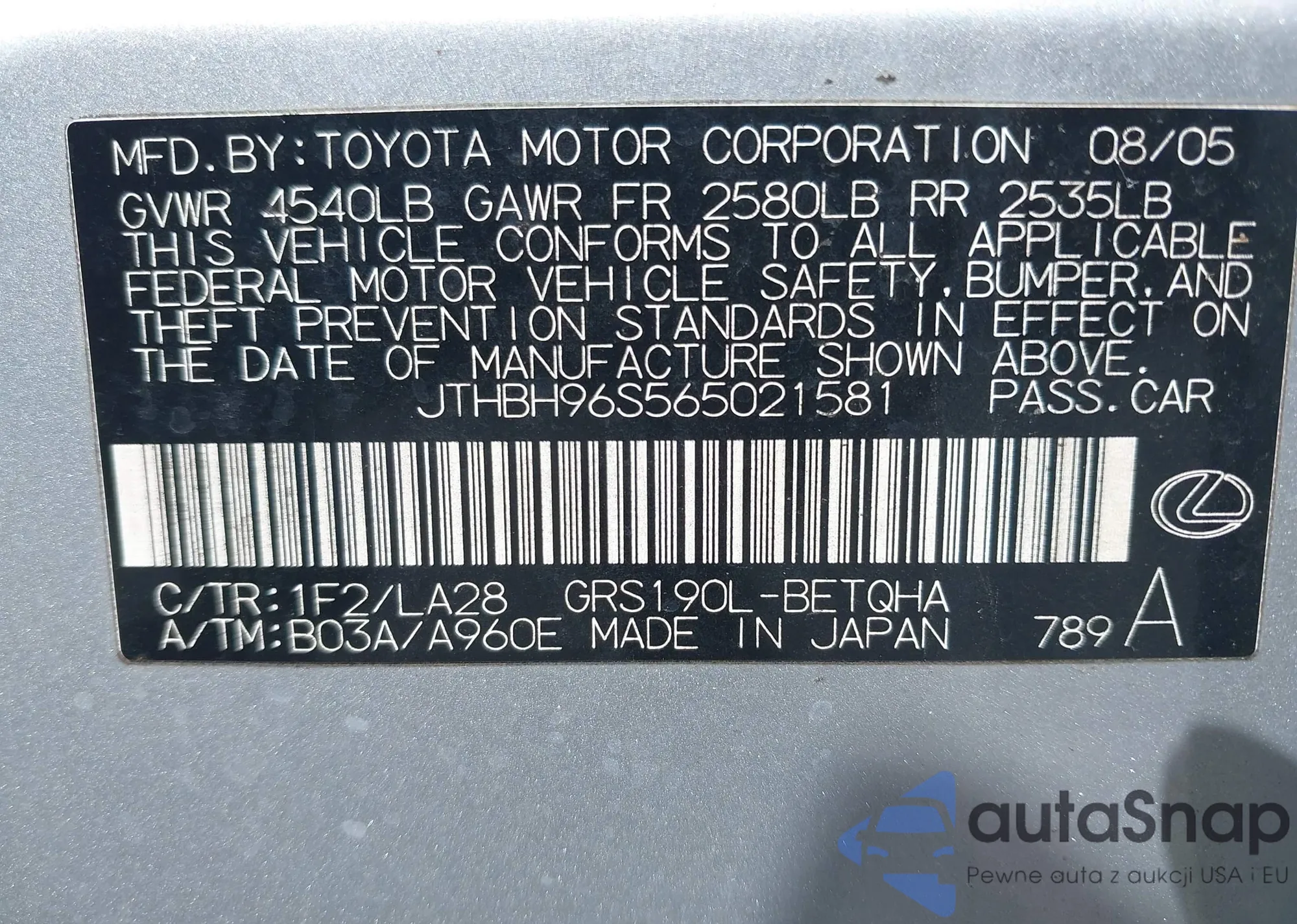 The car Lexus GS 300 2006 (VIN JTHBH96S565021581) is sold by an unverified seller. We recommend checking the Carfax report and confirming registration possibilities before purchase.