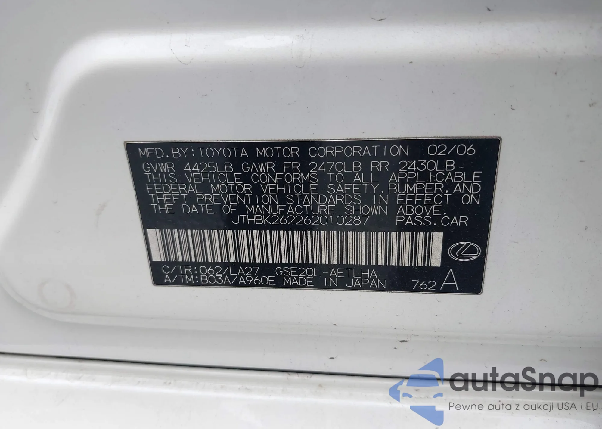 VIN: JTHBK262262010287