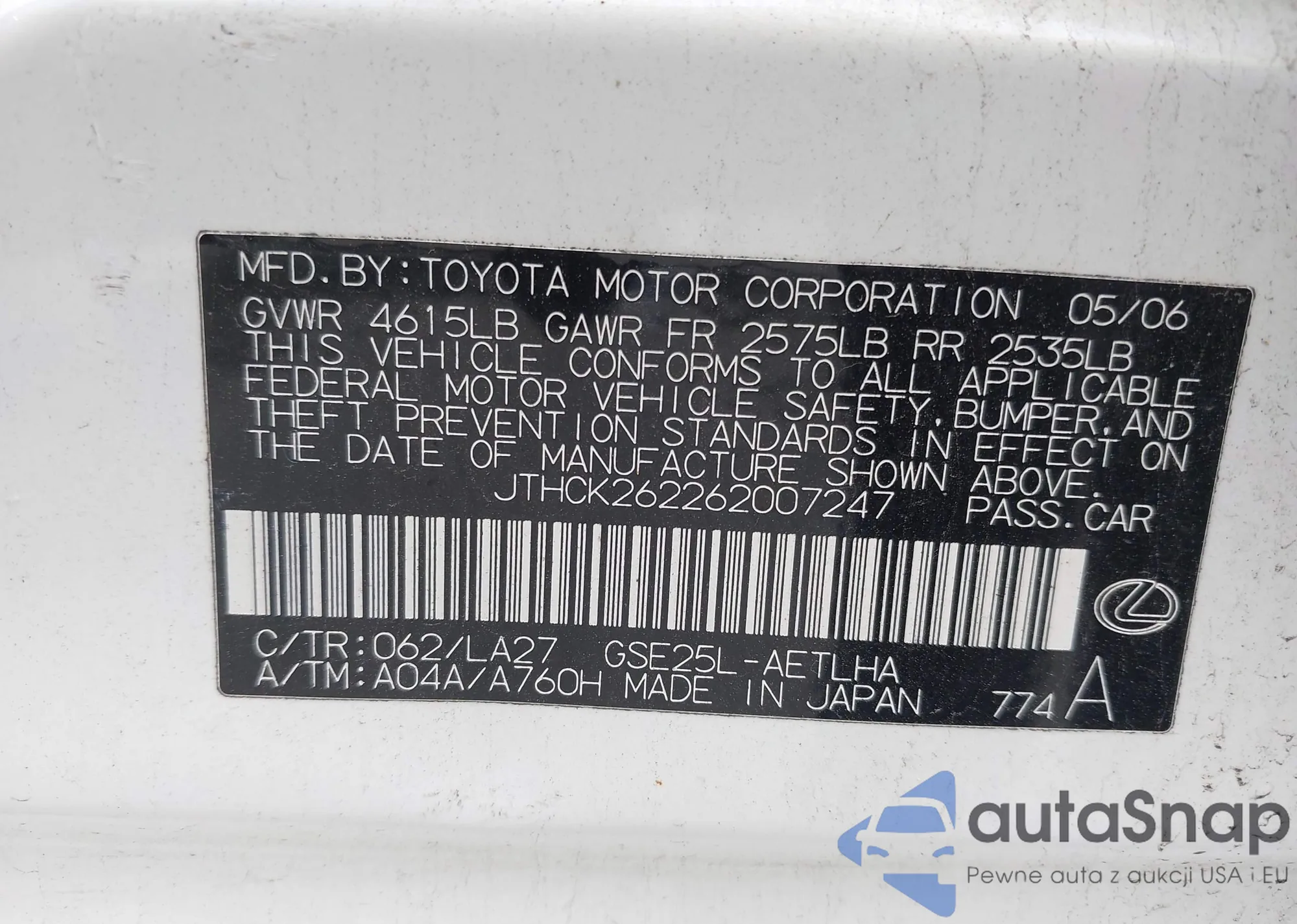 VIN: JTHCK262262007247