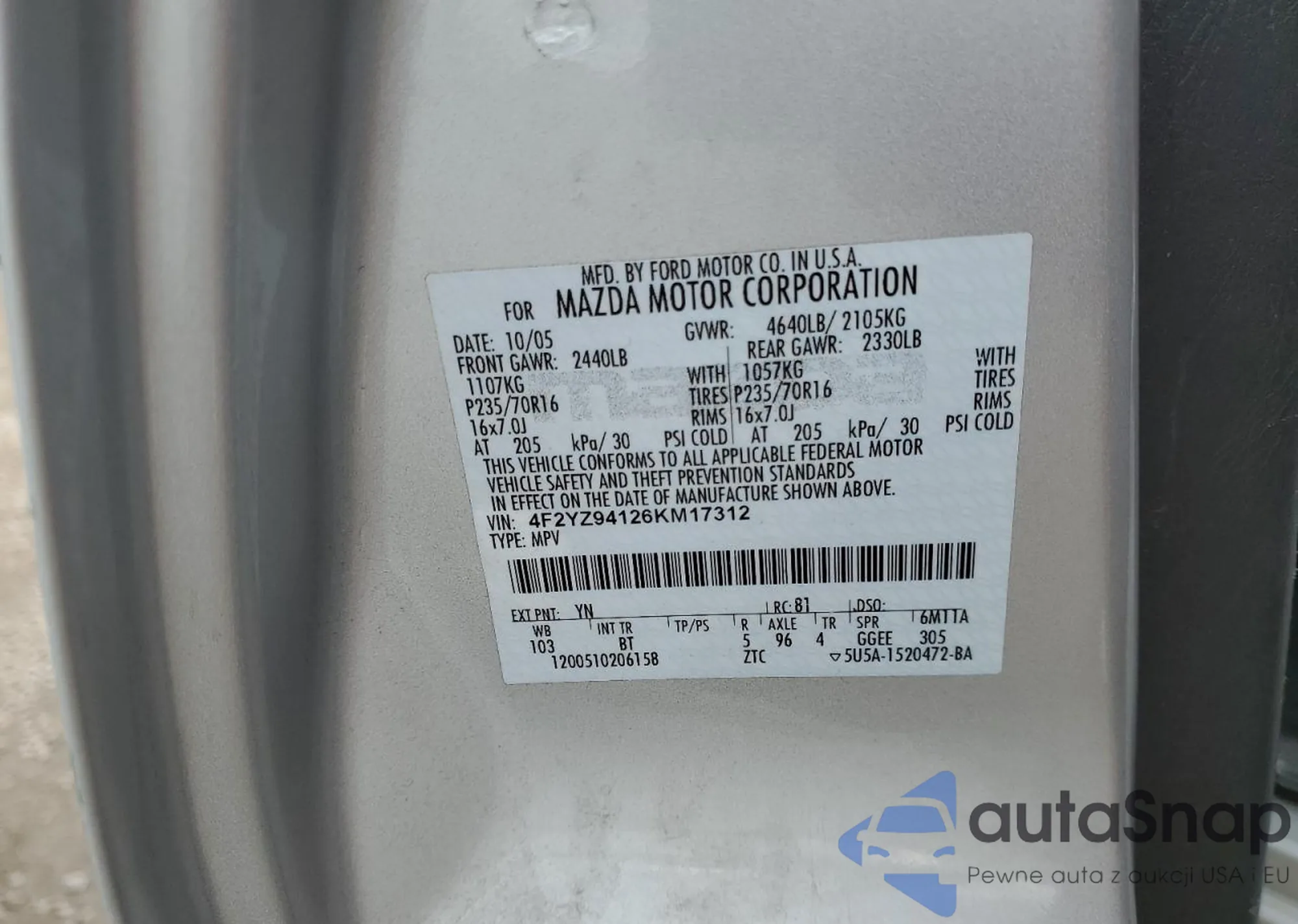 The car Mazda Tribute 2006 (VIN 4F2YZ94126KM17312) is sold by an unverified seller. We recommend checking the Carfax report and confirming registration possibilities before purchase.