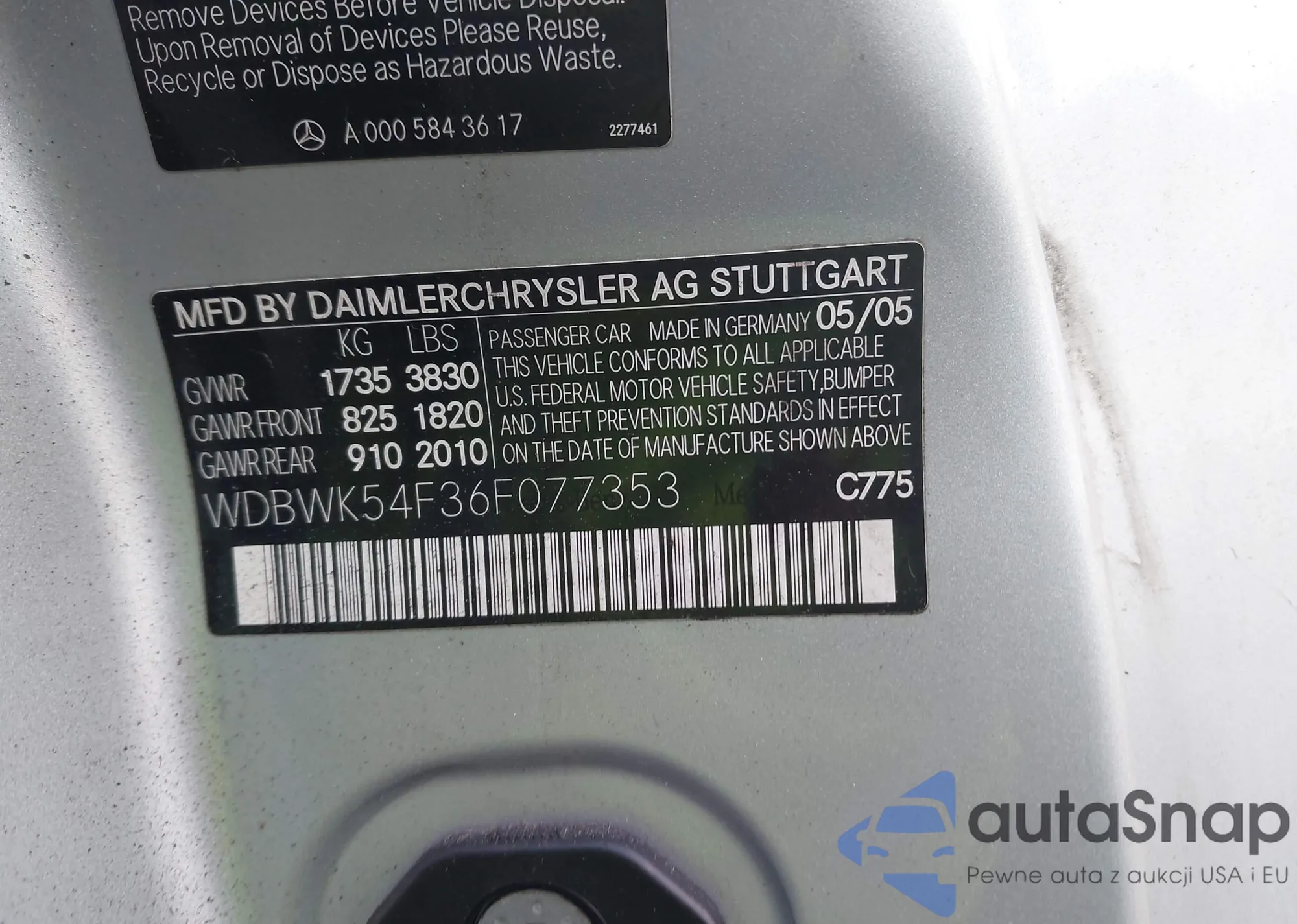 The car Mercedes-Benz SLK-klasse 2006 (VIN WDBWK54F36F077353) has documents that prevent registration. Export and registration may be difficult. Contact AutaSnap experts to find alternatives.