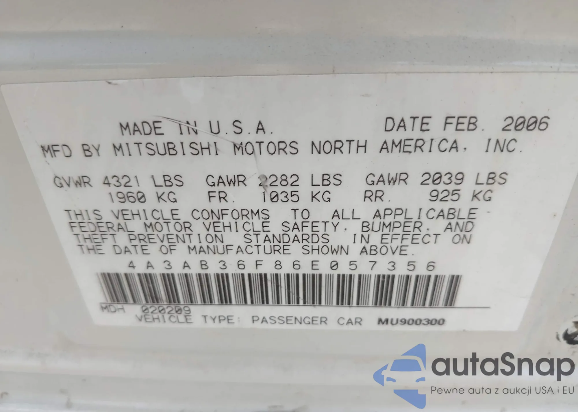The car Mitsubishi Galant 2006 (VIN 4A3AB36F86E057356) has not been auctioned before. The documents are clean, and the mileage matches or is below the market average. Sold by an insurance company – we recommend purchase. Delivery to the port will take approx. 6–8 weeks.