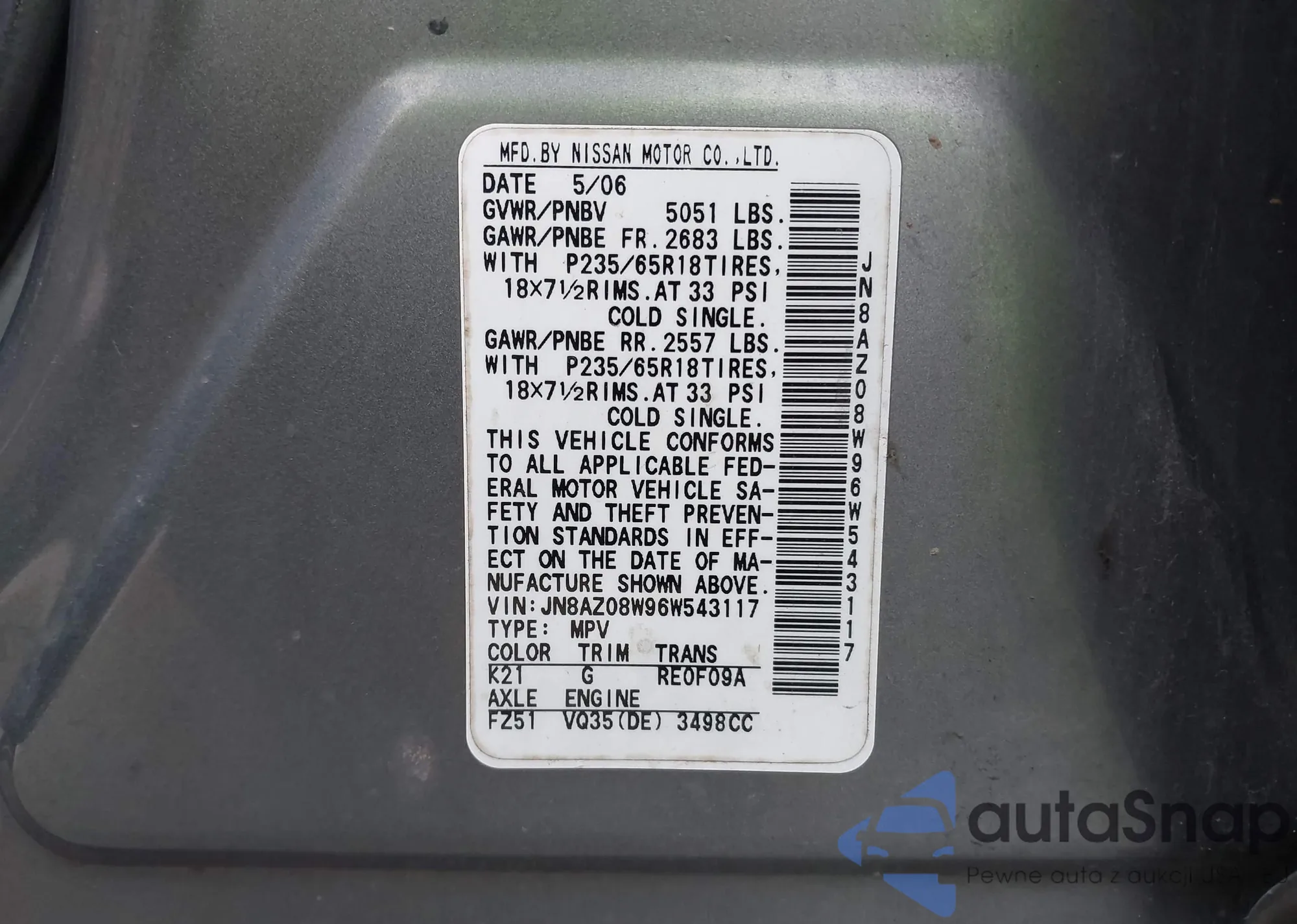 VIN: JN8AZ08W96W543117