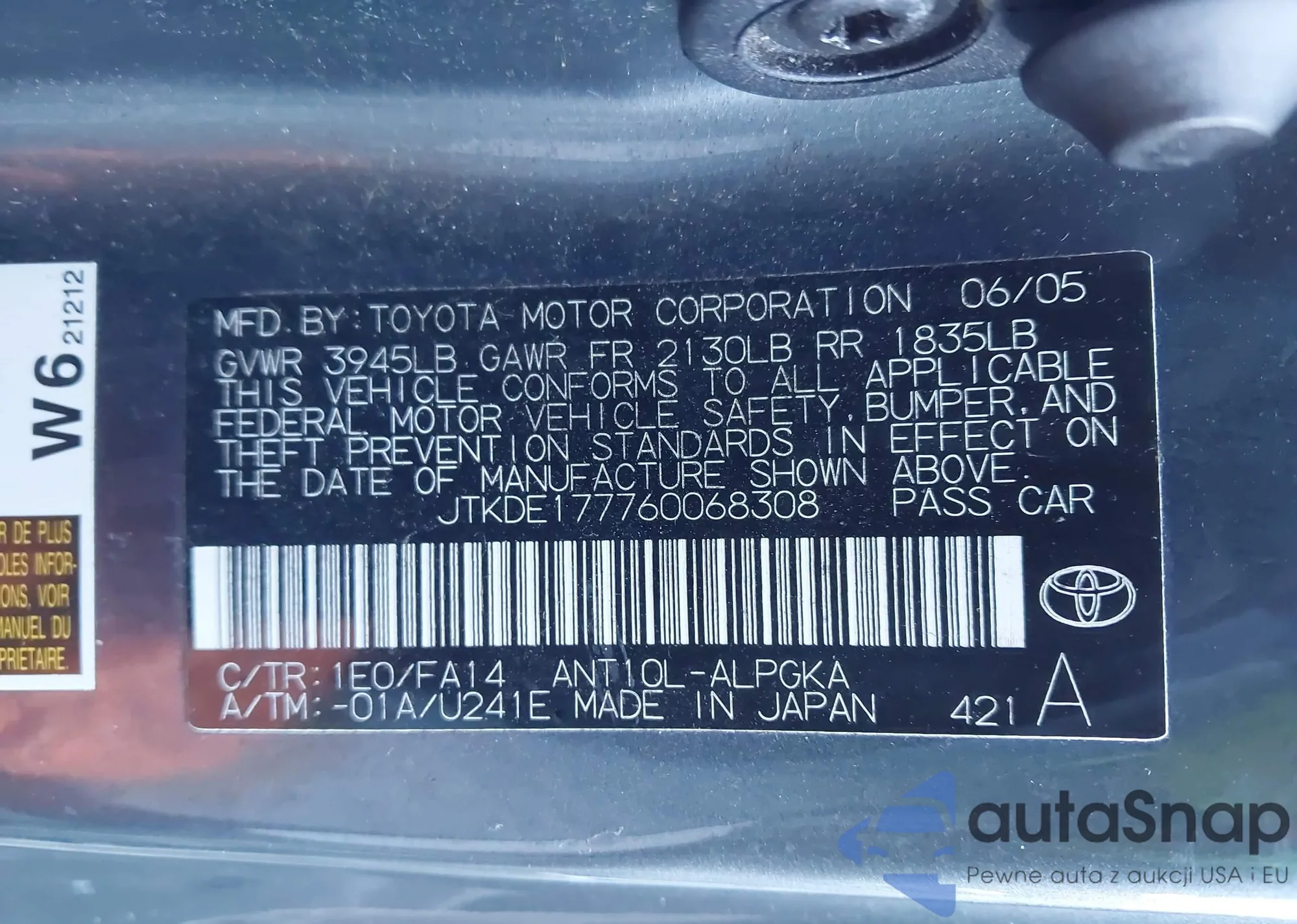 VIN: JTKDE177760068308