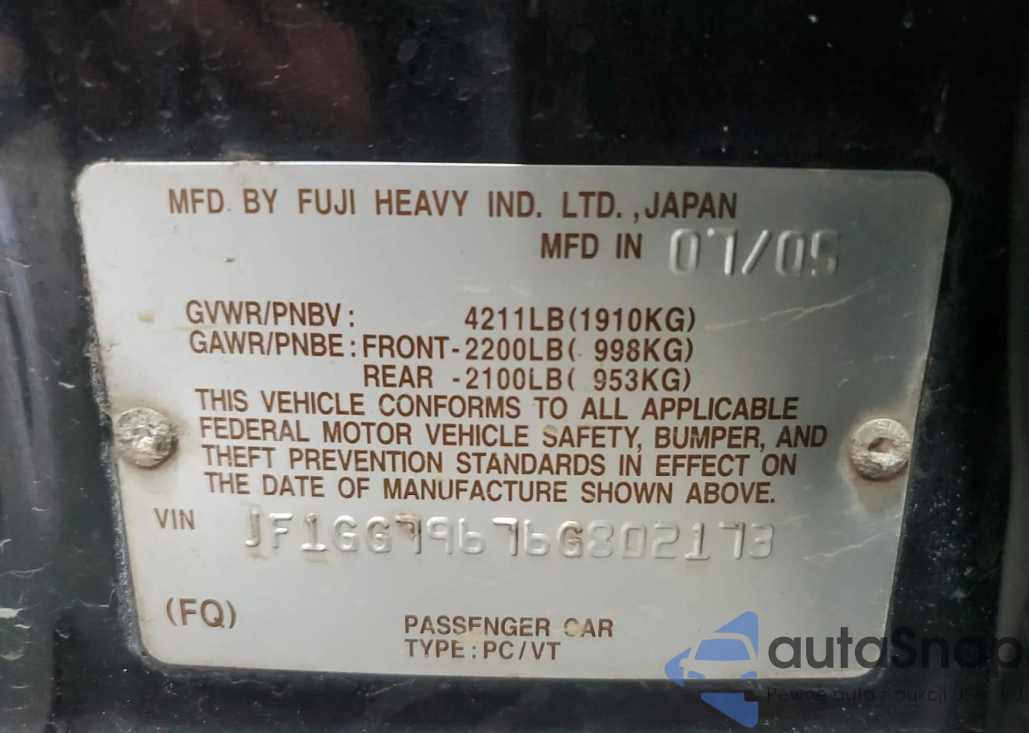 The car Subaru Impreza 2006 (VIN JF1GG79676G802173) is sold by an unverified seller. We recommend checking the Carfax report and confirming registration possibilities before purchase.