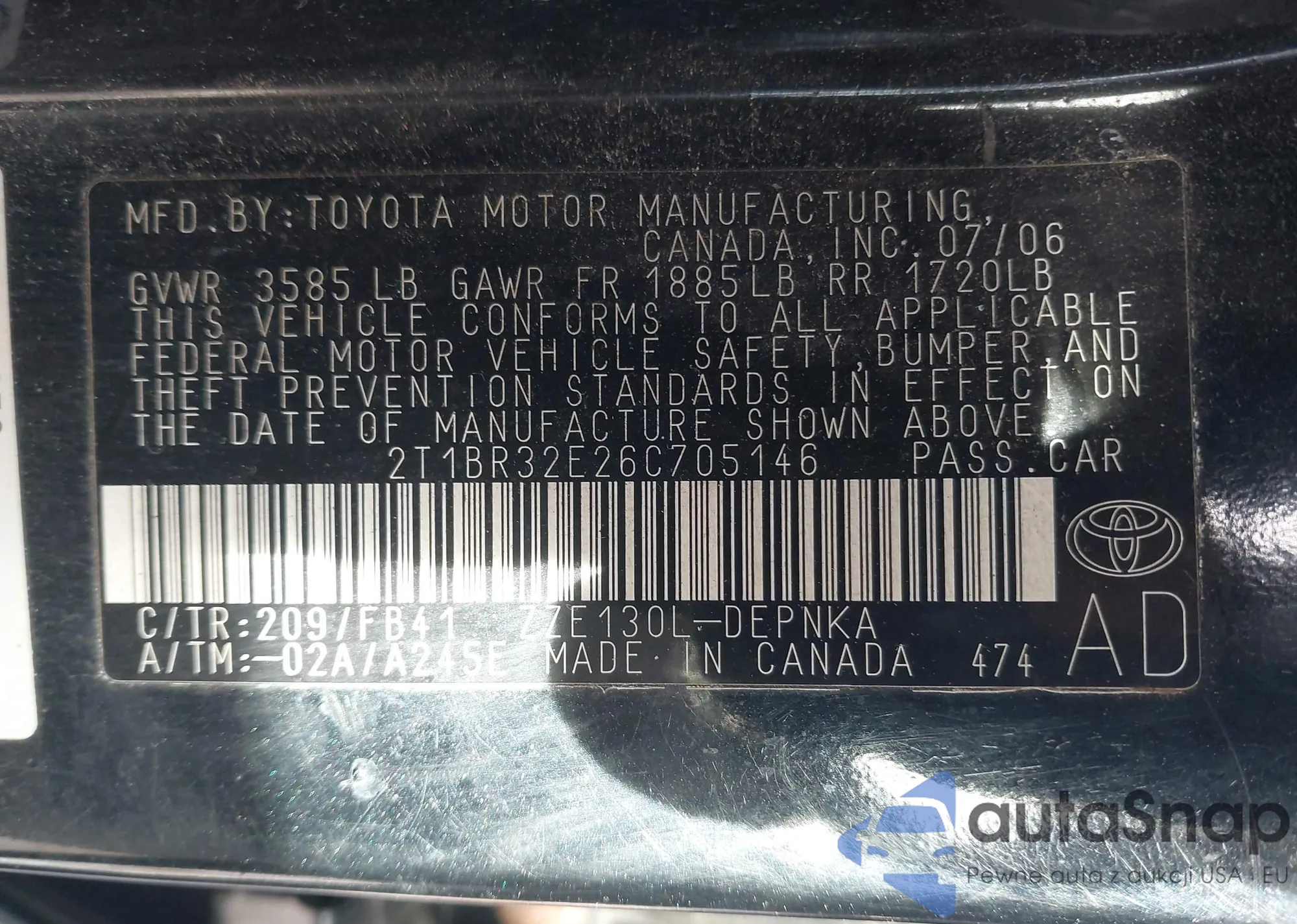 The car Toyota Corolla 2006 (VIN 2T1BR32E26C705146) has not been auctioned before. The documents are clean, and the mileage matches or is below the market average. Sold by an insurance company – we recommend purchase. Delivery to the port will take approx. 6–8 weeks.