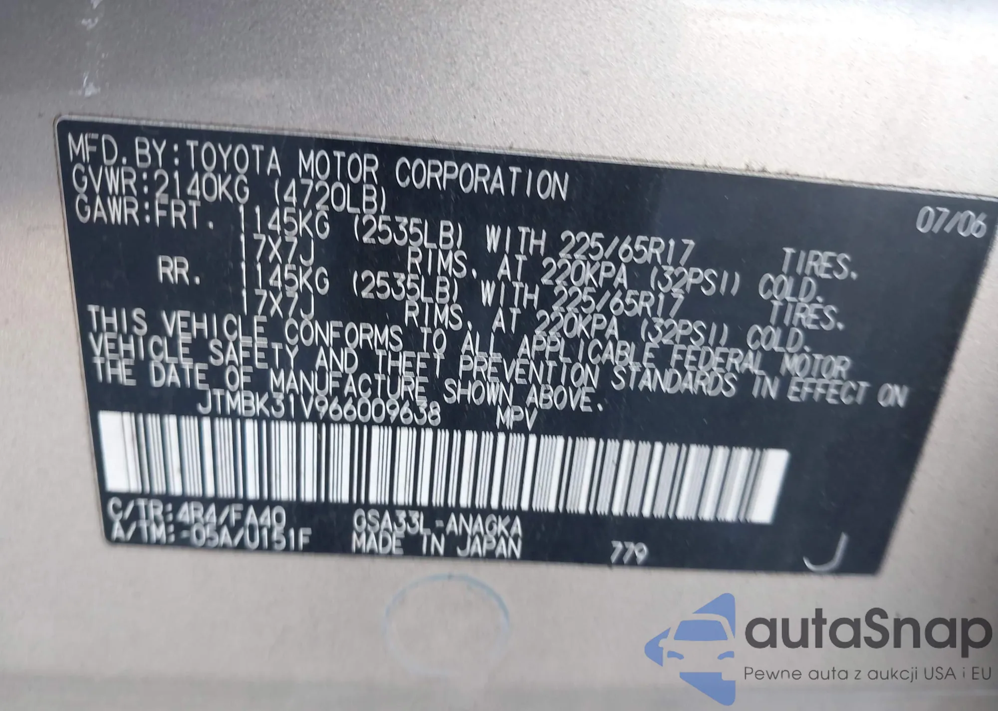 VIN: JTMBK31V966009638