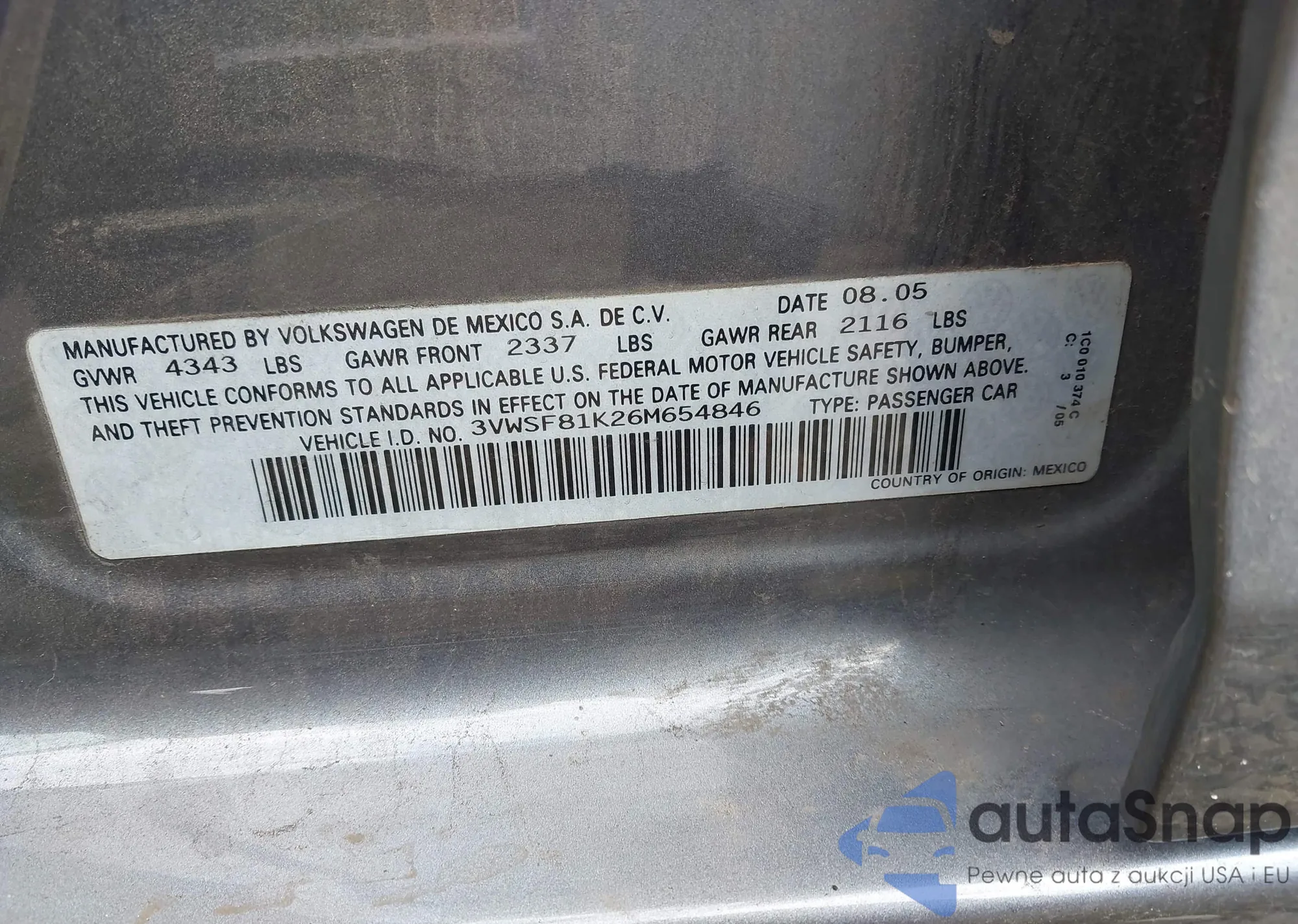 VIN: 3VWSF81K26M654846