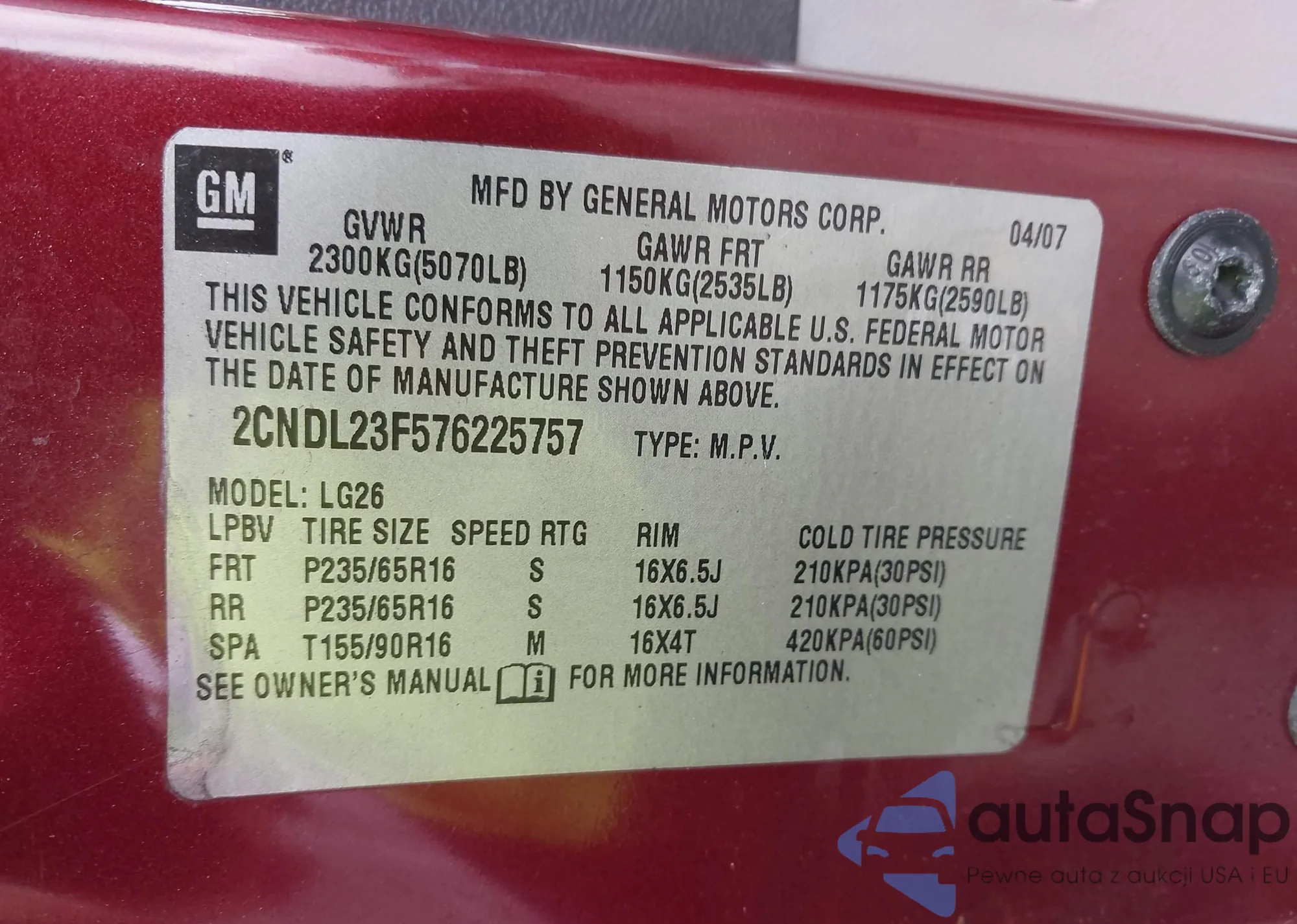 The car Chevrolet Equinox 2007 (VIN 2CNDL23F576225757) is sold by an unverified seller. We recommend checking the Carfax report and confirming registration possibilities before purchase.