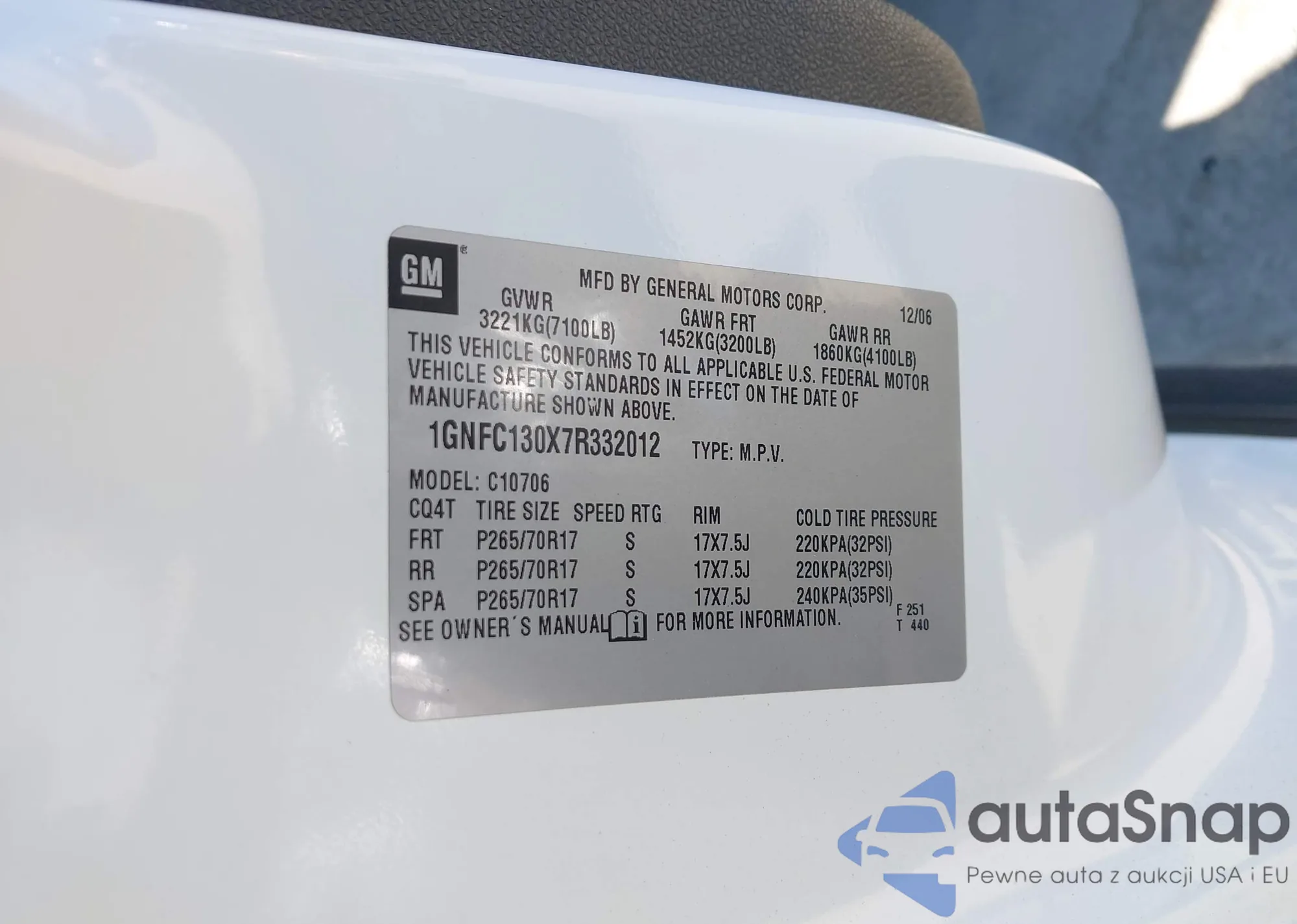 The car Chevrolet Tahoe 2007 (VIN 1GNFC130X7R332012) has not been auctioned before. The documents are clean, and the mileage matches or is below the market average. Sold by an insurance company – we recommend purchase. Delivery to the port will take approx. 6–8 weeks.