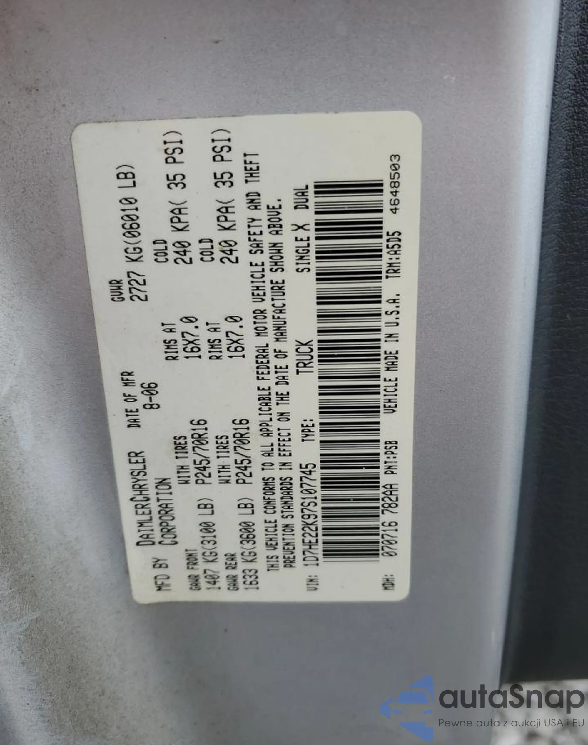 The car Dodge Dakota 2007 (VIN 1D7HE22K97S107745) is sold by an unverified seller. We recommend checking the Carfax report and confirming registration possibilities before purchase.