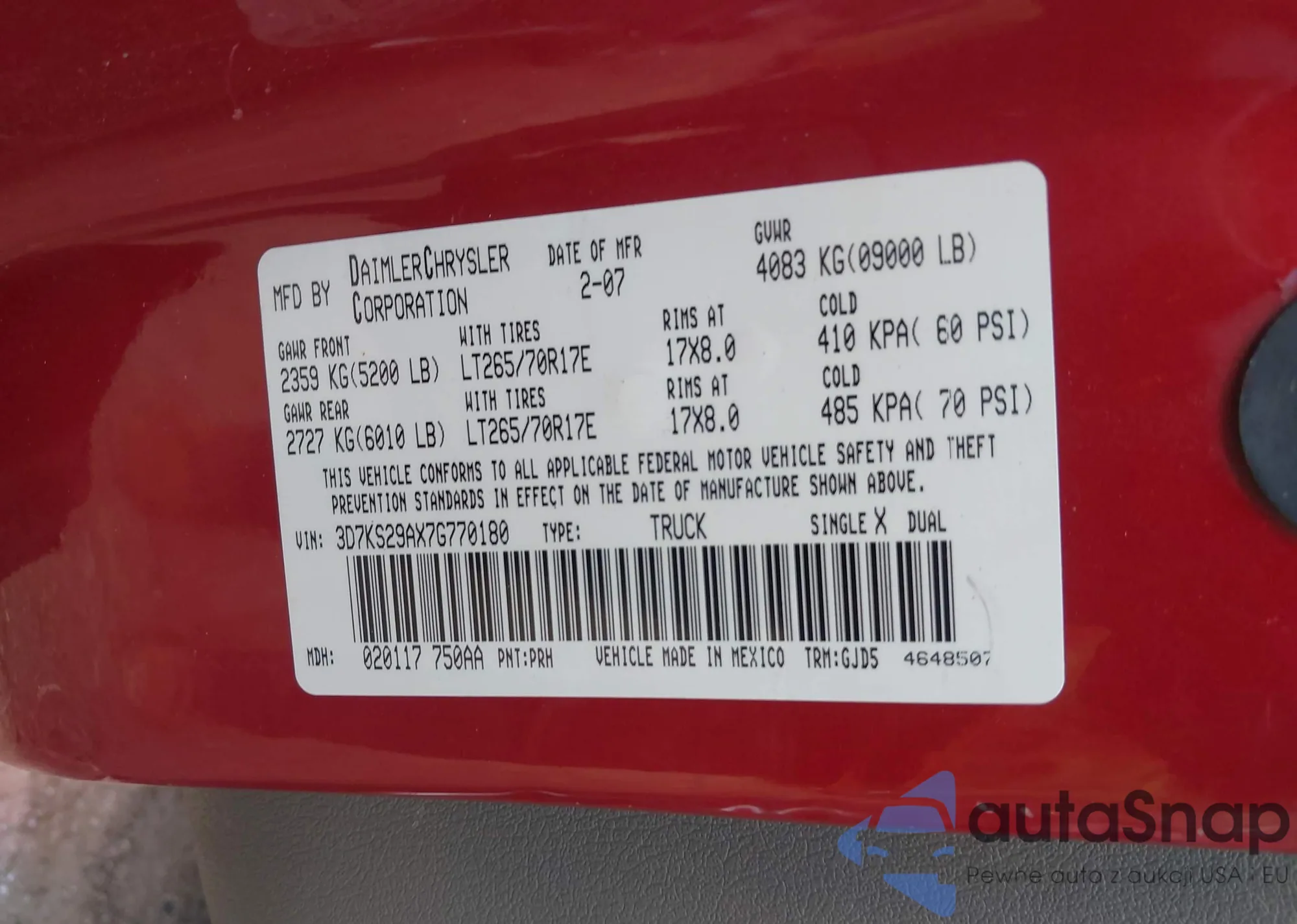 The car Dodge RAM 2007 (VIN 3D7KS29AX7G770180) has not been auctioned before. The documents are clean, and the mileage matches or is below the market average. Sold by an insurance company – we recommend purchase. Delivery to the port will take approx. 6–8 weeks.