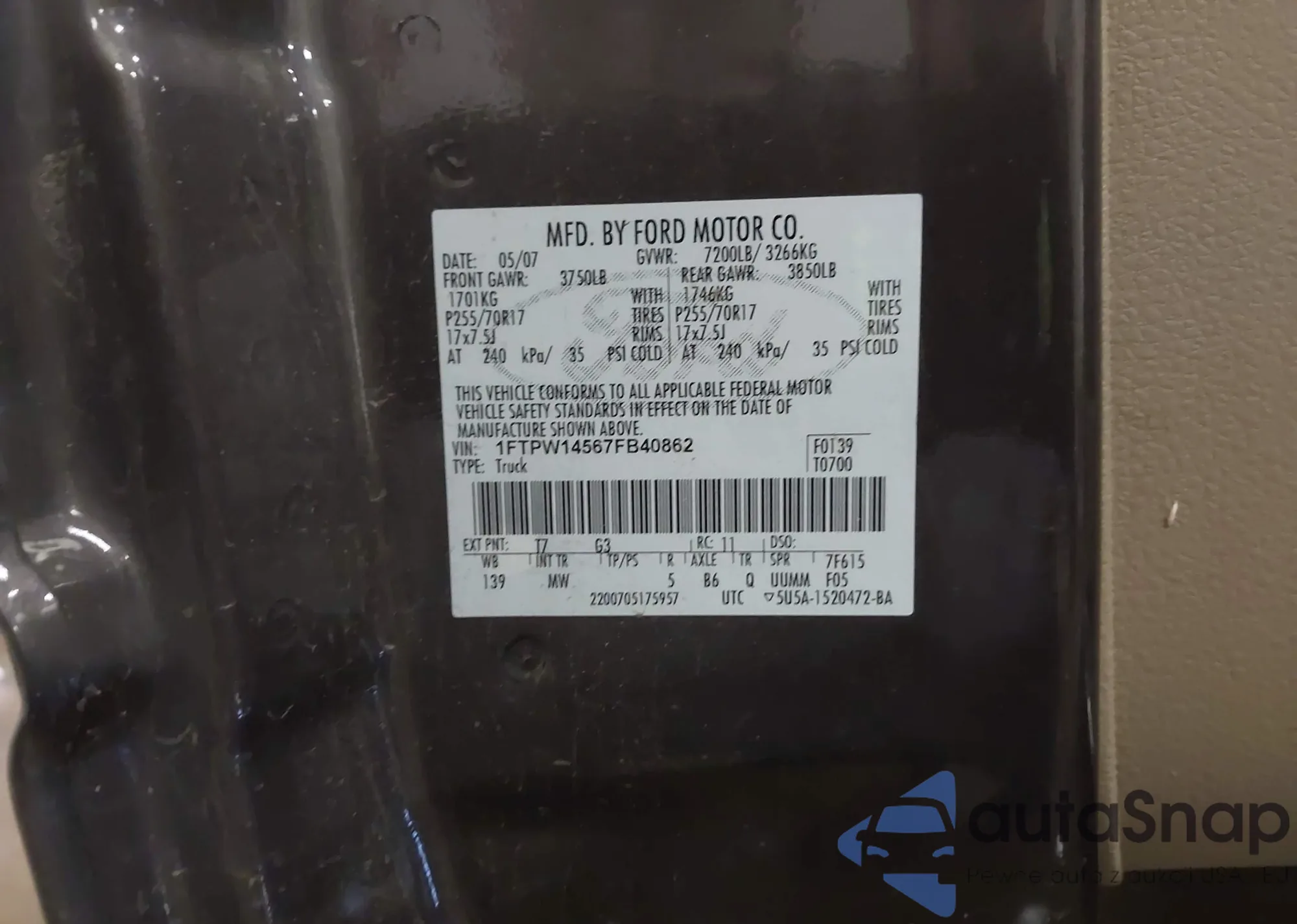 VIN: 1FTPW14567FB40862