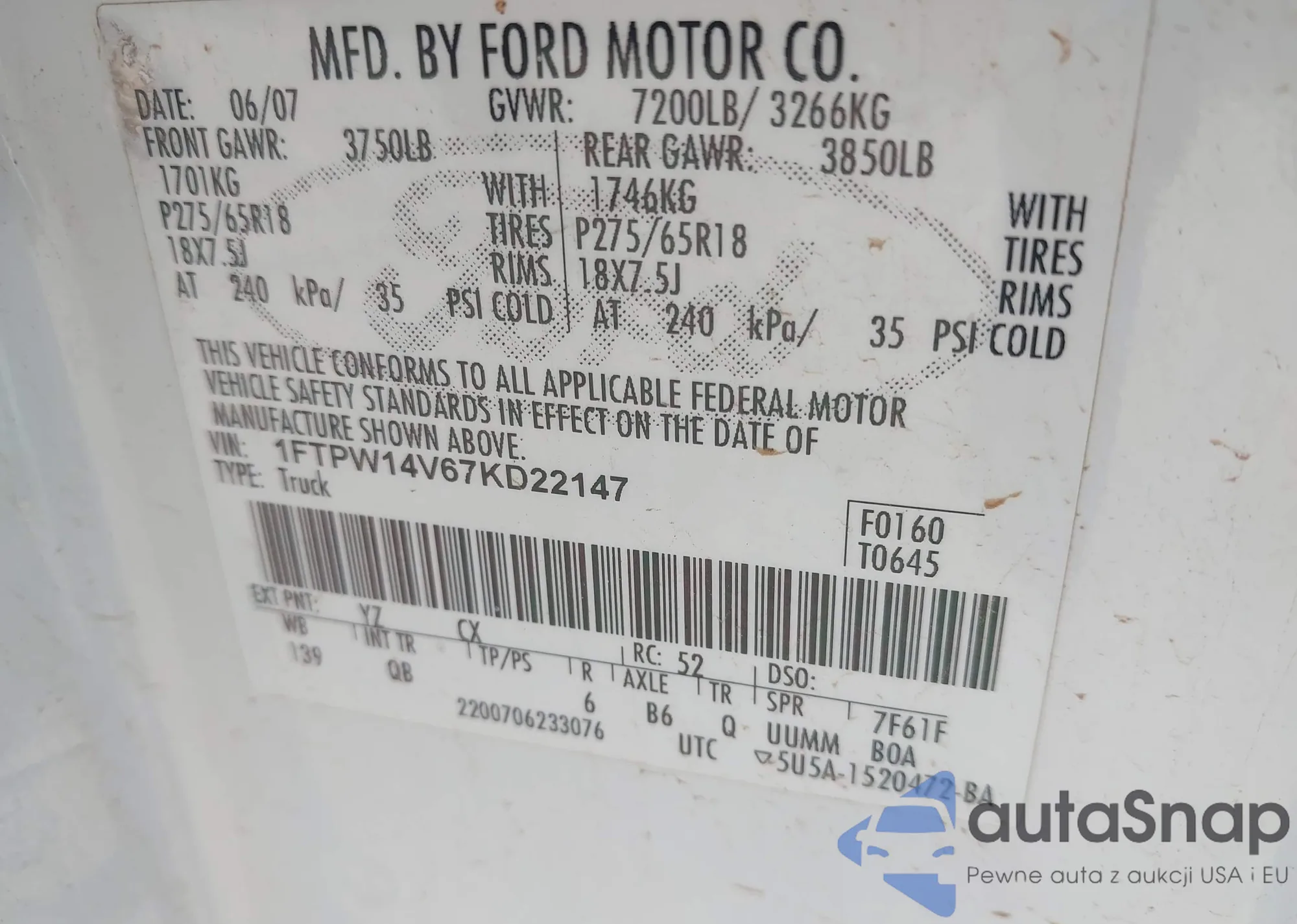 VIN: 1FTPW14V67KD22147